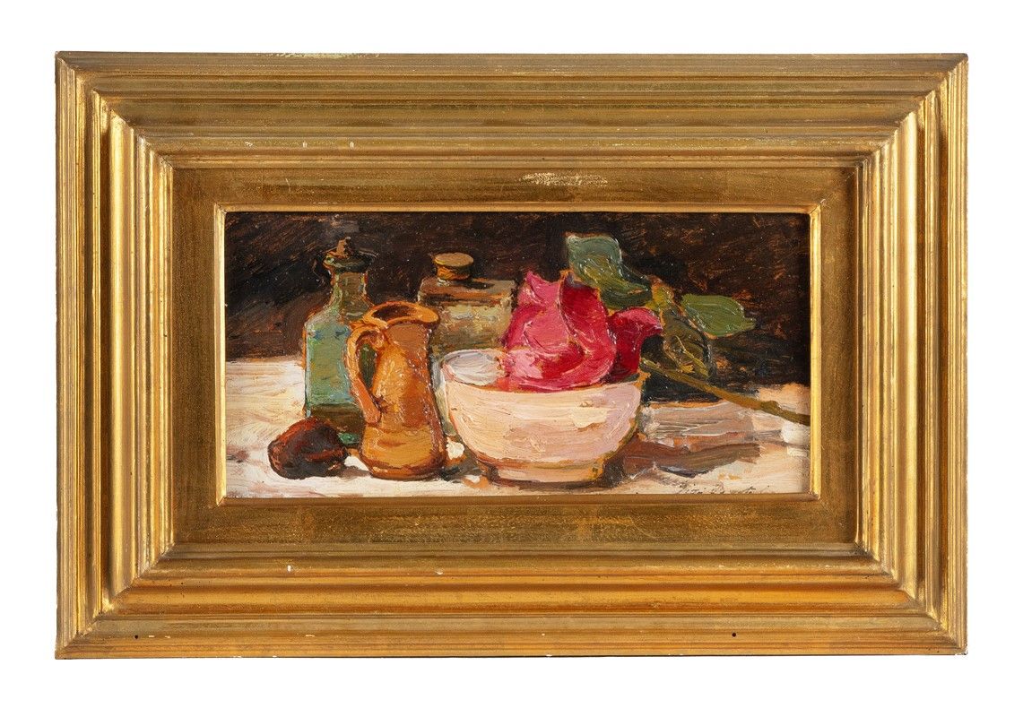 Olio su cartoncino. cm 15x30. Firmato in basso a destra. Iscrizione a penna e inchiostro di china nero al verso: "Questa è una delle più belle e preziose tavolette di Giovanni Bartolena dipinta nel suo periodo migliore, verso il 1900" firmata M. Borgiotti.
