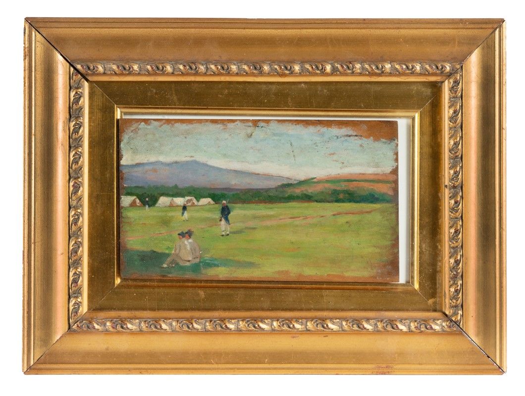 Olio su tavoletta. cm 13,2x23. Firmato e datato a penna e inchiostro di china bruno su piccola etichetta applicata al verso del cartone di supporto, probabilmente riposizionata durante la messa in cornice. Etichetta a stampa recante i dati dell'opera applicata al verso della cornice.