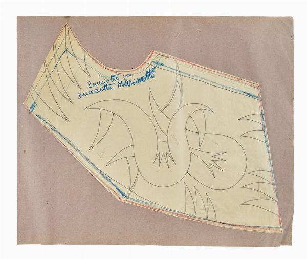 Matita, pastello rosso e pastello blu su carta. mm 442x590. Titolo autografo in alto a sinistra. Varie indicazioni di colore sul disegno. Opera archiviata nella sezione Disegni del Catalogo Generale Ragionato delle Opere dell'Artista da parte del Dottor Scudiero con il numero d'ingresso: FD-4169-DIS. I gilet (o panciotti) futuristi di Depero furono ideati e realizzati in vista della tournée del Teatro Futurista che si tenne nel 1924 e nel cui ambito furono appunto indossati dai più importanti futuristi che vi parteciparono. Furono realizzati ad personam, cioè in copia unica. Questo, in particolare, originariamente pensato per la moglie di Marinetti, Benedetta Cappa, fu poi modificato nelle dimensioni, realizzato e indossato dal fondatore del Futurismo, F. T. Marinetti. Bibliografia: per la versione finale del gilet realizzato si veda M. Scudiero, F. Depero. Stoffe futuriste, Trento, 1995, pag. 48 e poi n. 262 a pag. 243.