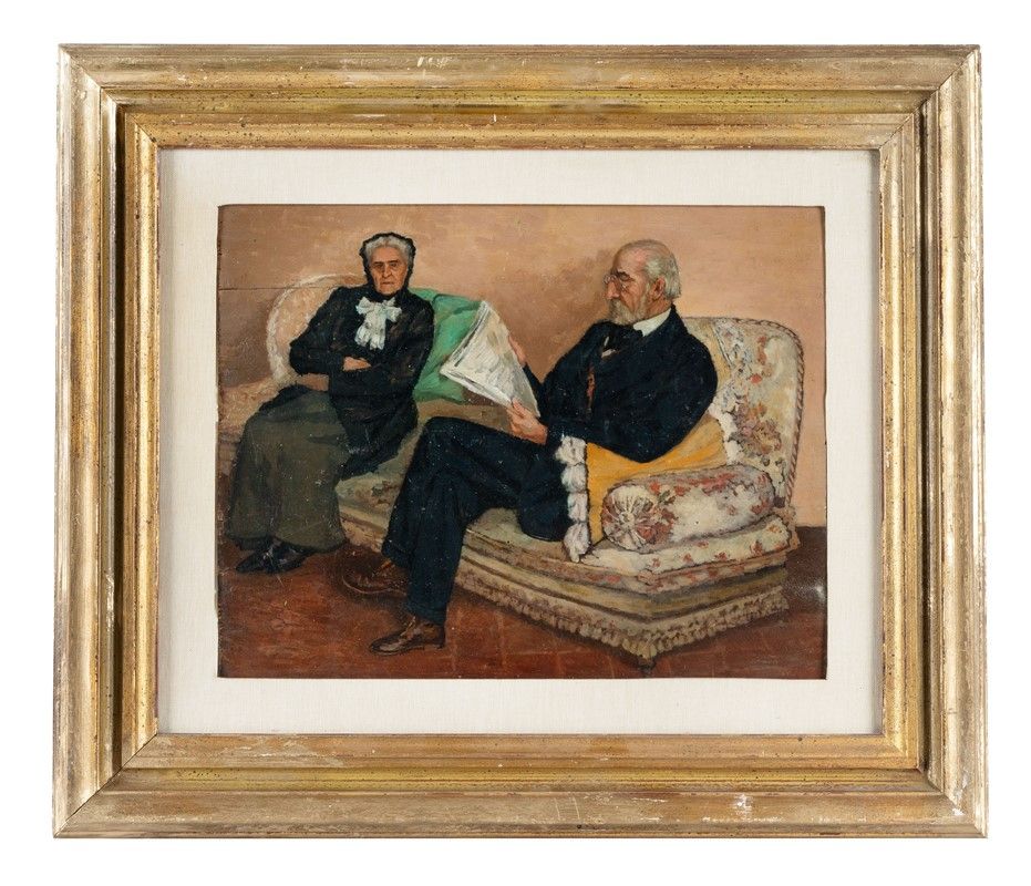 Olio su tavola. cm 35,8x43,8. Firma e iscrizione "Ritratti dei M.si B. Salimbeni / dip. in Gello nella loro villa / l'anno 1914" a inchiostro di china nero sul verso. Coppia di parziali timbri a cera-lacca nera posti al verso, sotto l'etichetta a stampa contenente i dati dell'opera. Ulteriori accenni di schizzi sul verso della tavola.
