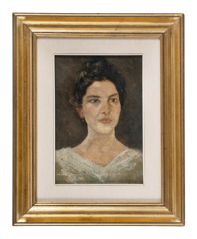 Olio su cartone. cm 33,6x23,4. Firmato in basso a destra. Etichetta manoscritta al verso: "Ritratto della figliastra di Giovanni Fattori dipinto del suo allievo Cesare Ciani".