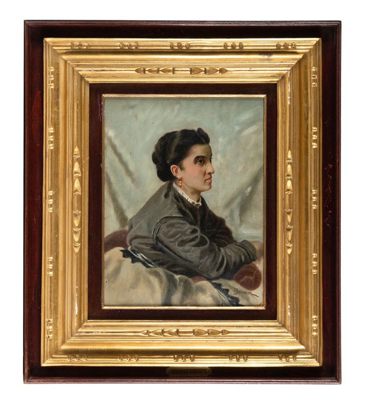 Olio su cartoncino. cm 31,5x23,5. Firmato in basso a destra. Targhetta metallica recante nome d'artista applicata al margine inferiore della cornice.