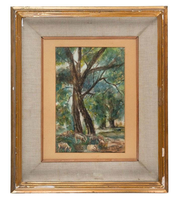 Acquerello. mm 300x200 (visibili). Firma a penna e inchiostro di china in basso a destra. Al verso adesivo de "Collezione Ugolini".