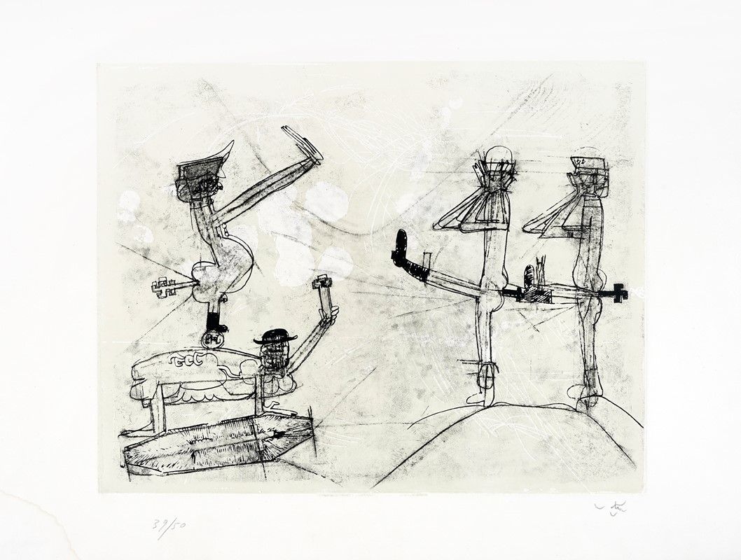 Acquatinta. mm 375x475. Foglio: mm 530x712. Firma a matita in basso a destra e tiratura in basso a sinistra. Es. 39/50.