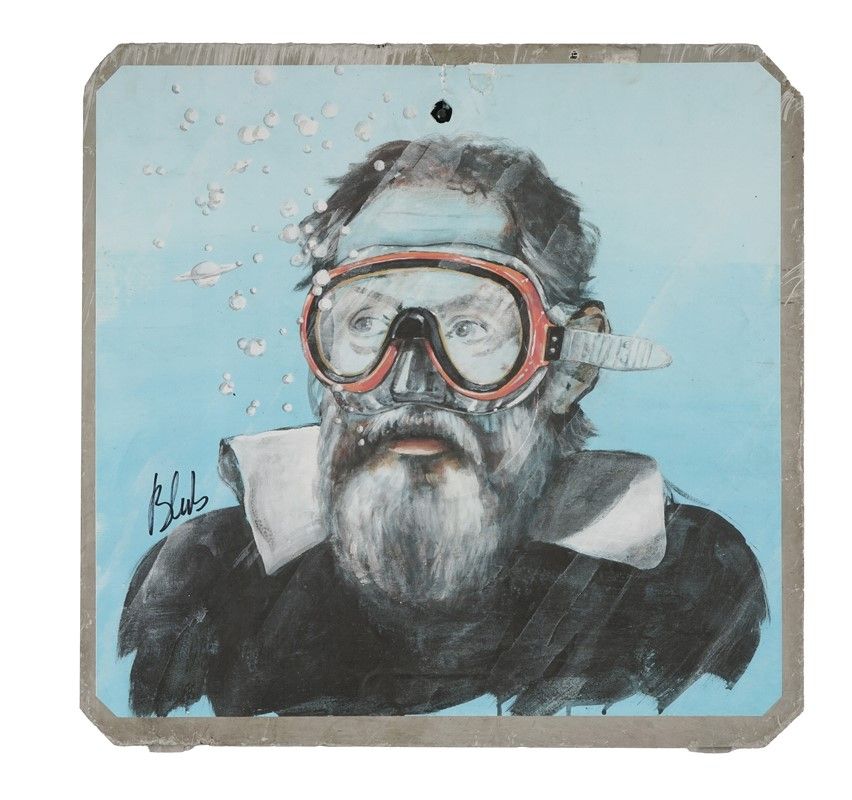 Offset. mm 350x355. Firma a pennarello nero in basso a sinistra. Opera applicata a pannello di recupero.