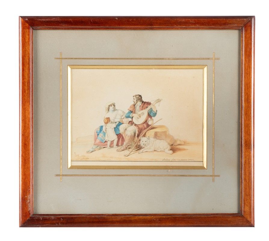 Matita, penna e inchiostro di china bruno e acquerello su carta. mm 200x270 (visibile). "Lindau Fecit. Roma 1833." in basso a destra. SI AGGIUNGE: Ferrari F., Briganti e donna. 1886. Acquerello su carta. mm 195x265 (visibile). Firmato e titolato a matita in basso a destra.