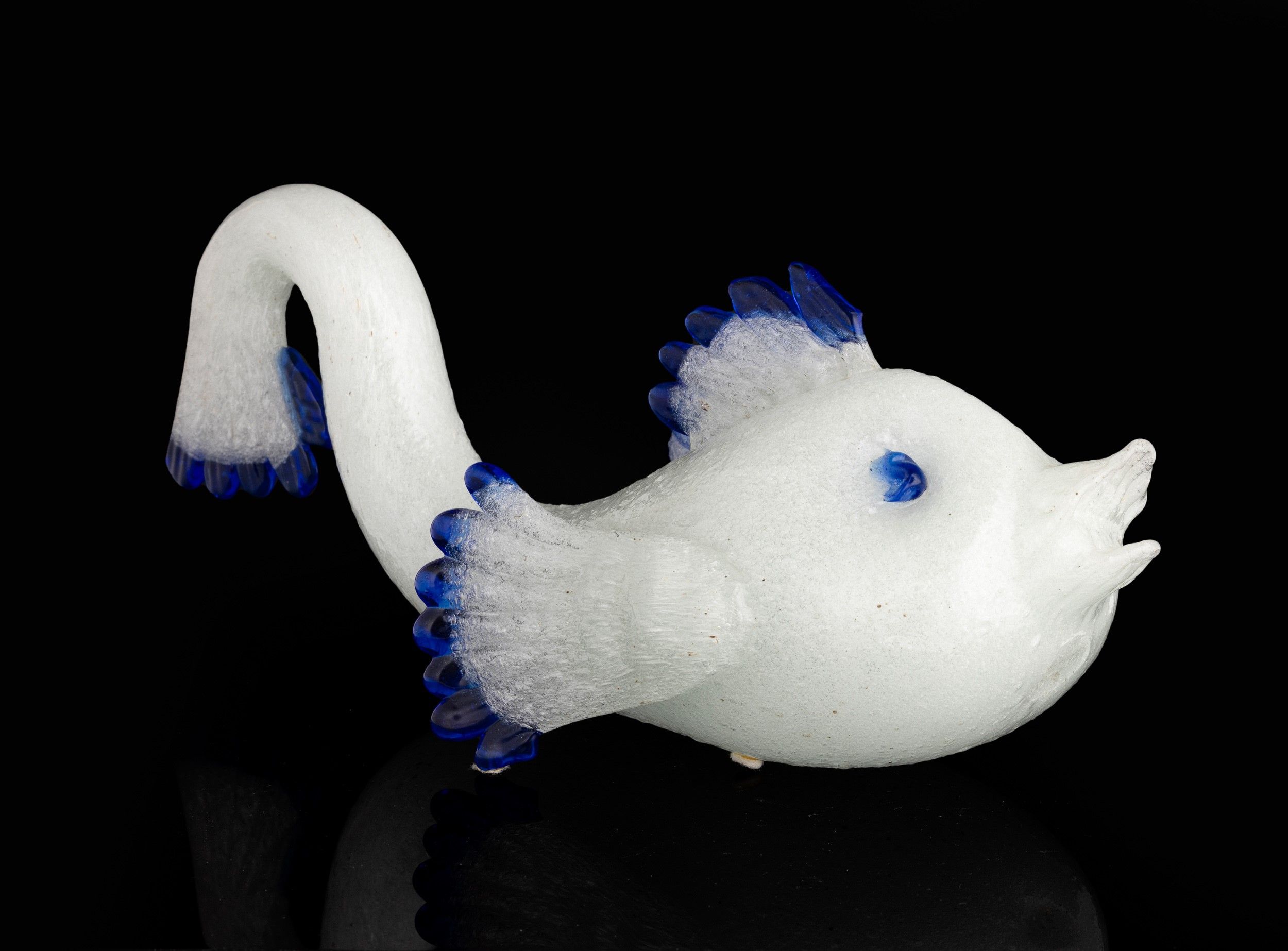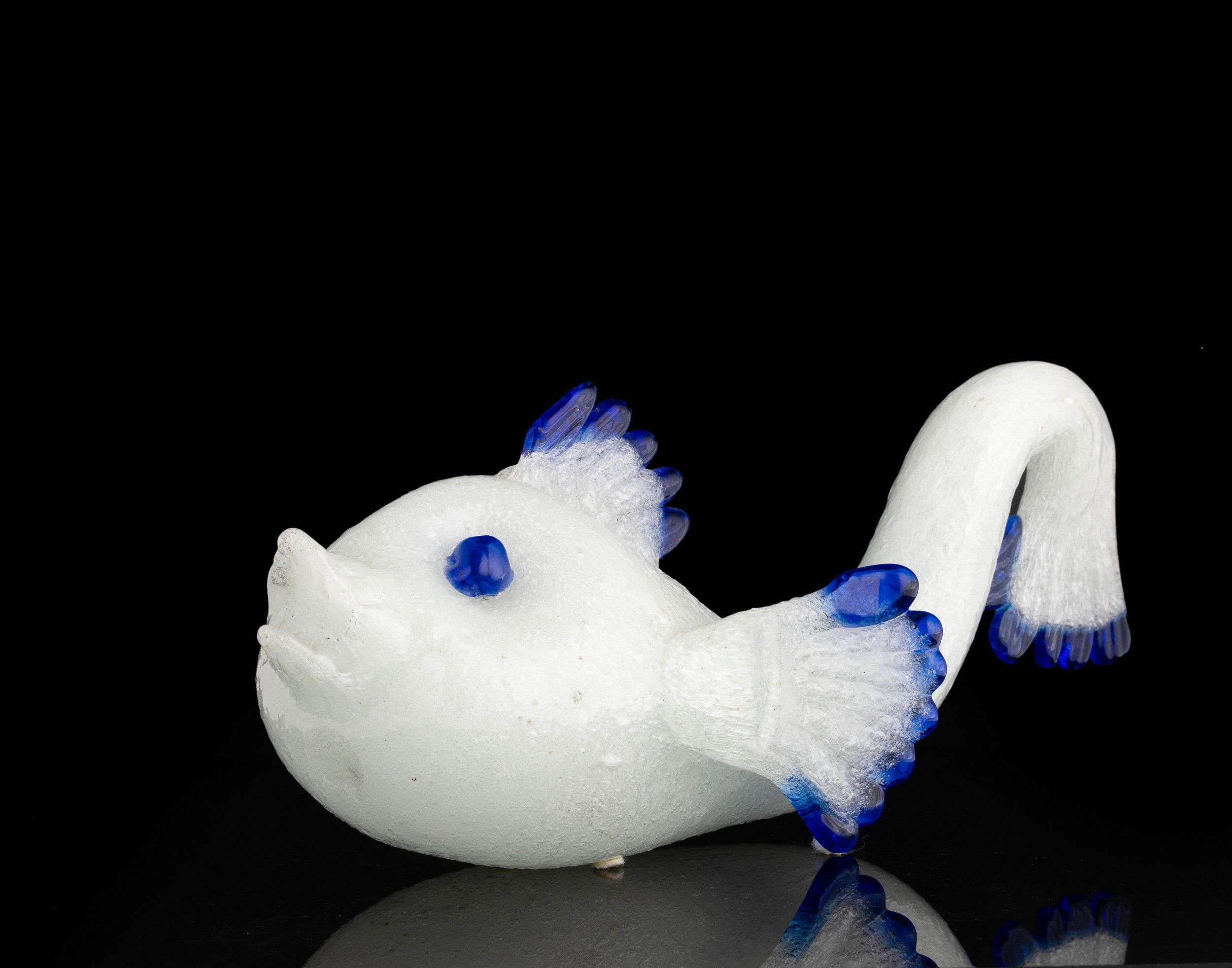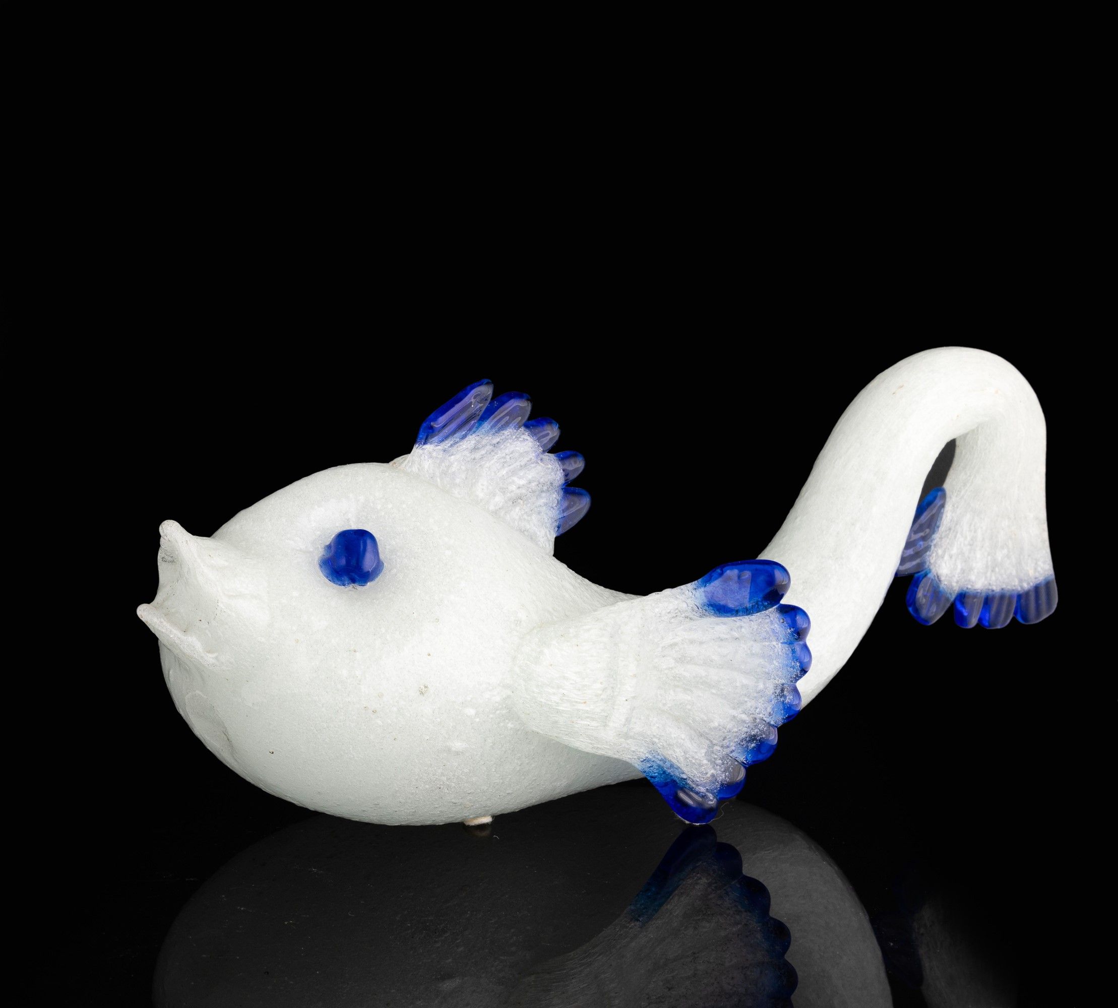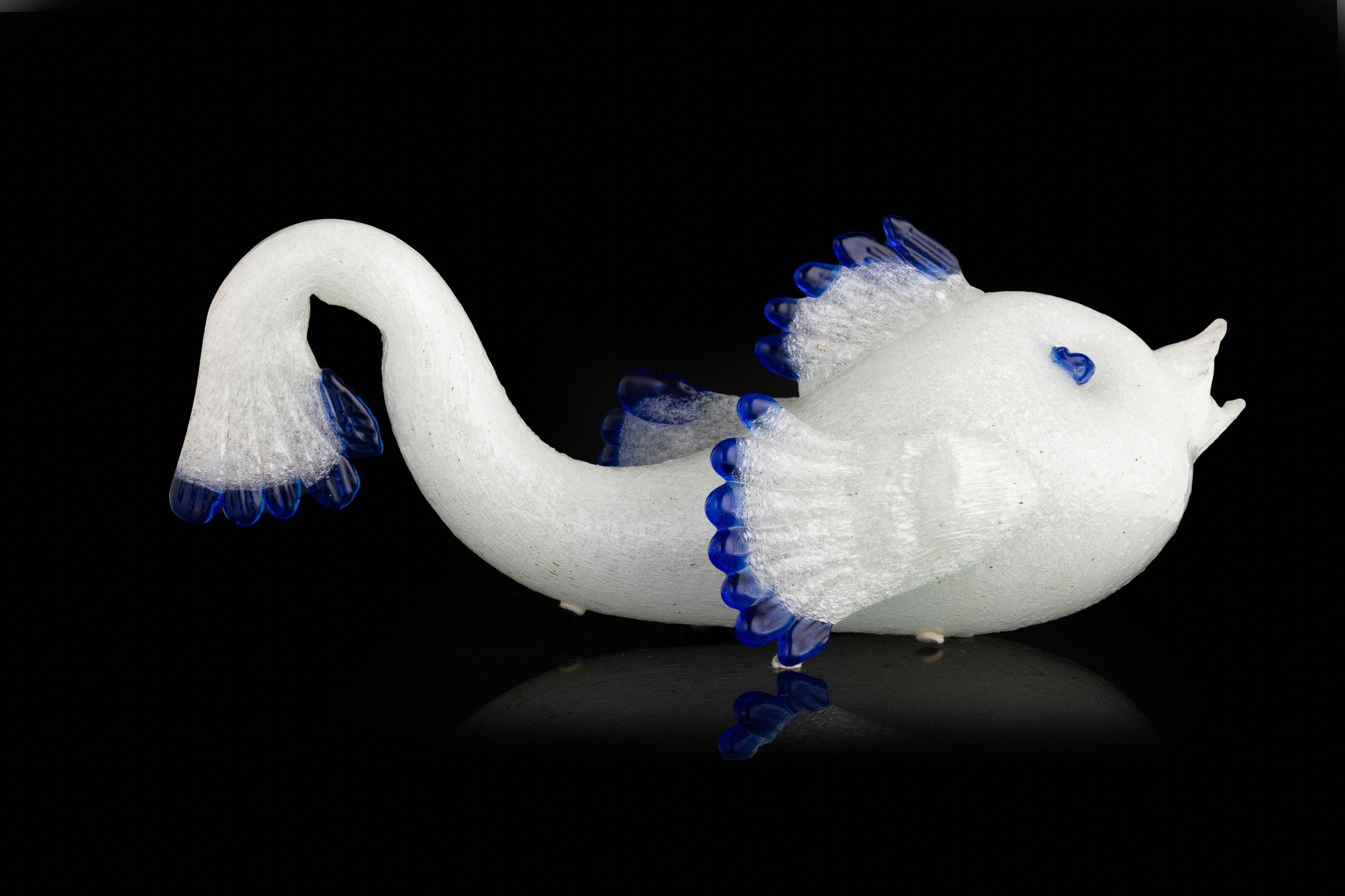Pesce fantastico in vetro pulegoso lattimo con finiture in vetro trasparente blu.