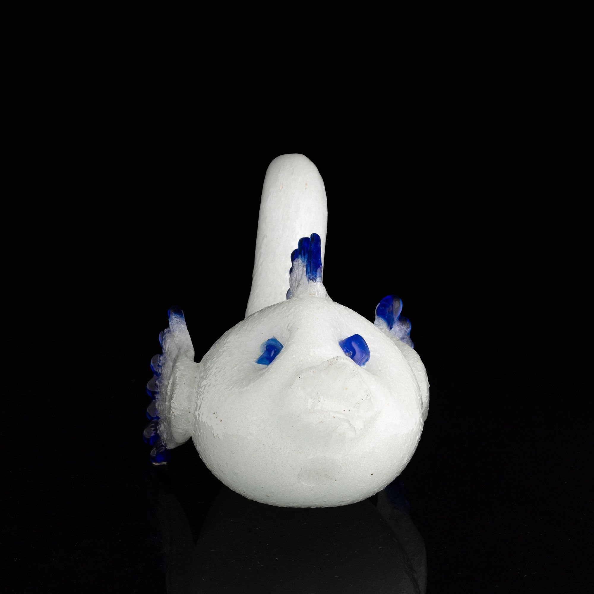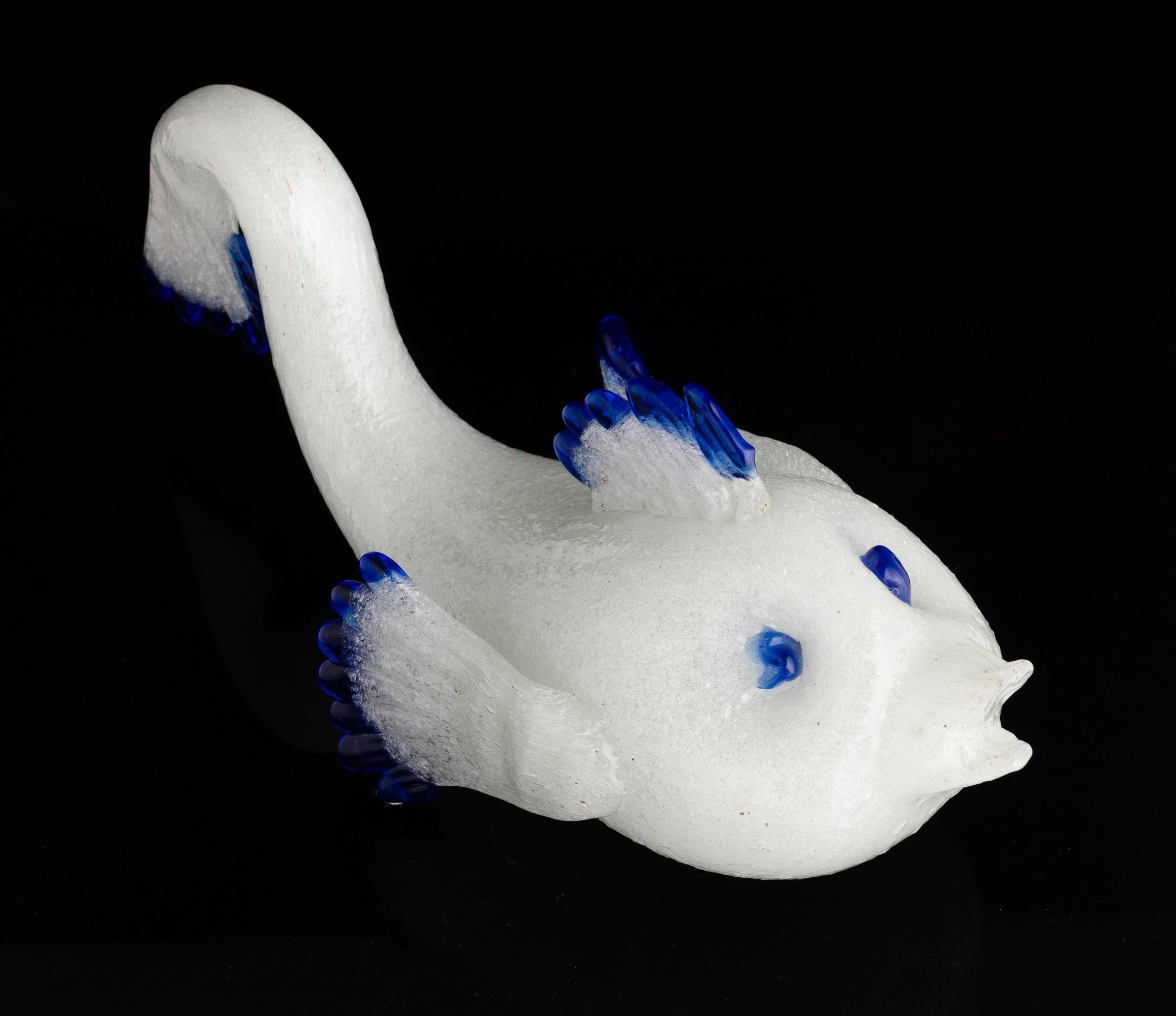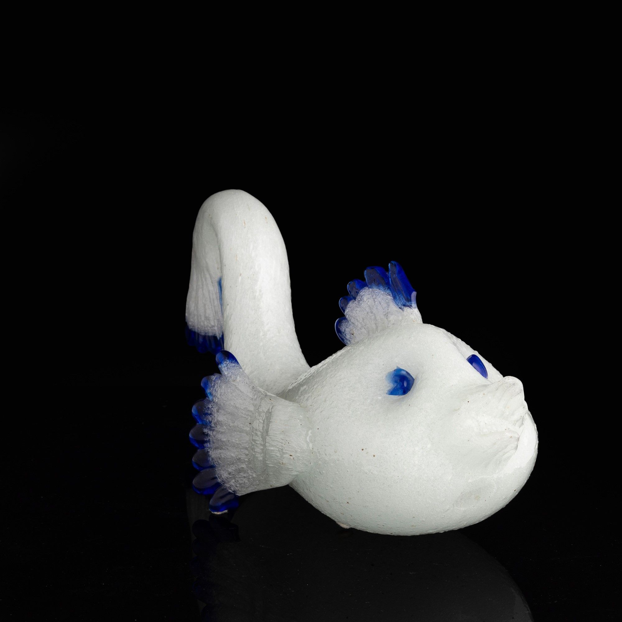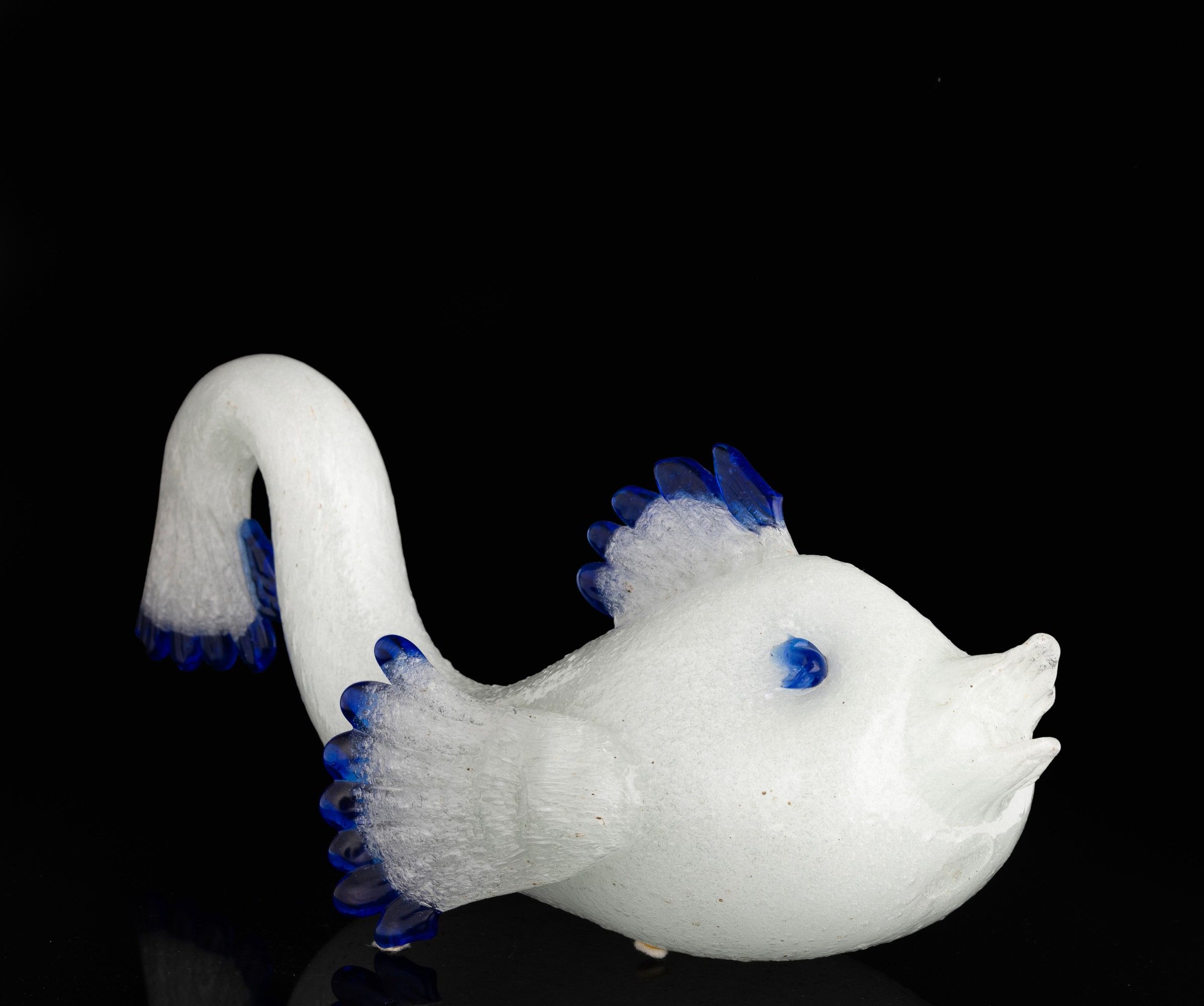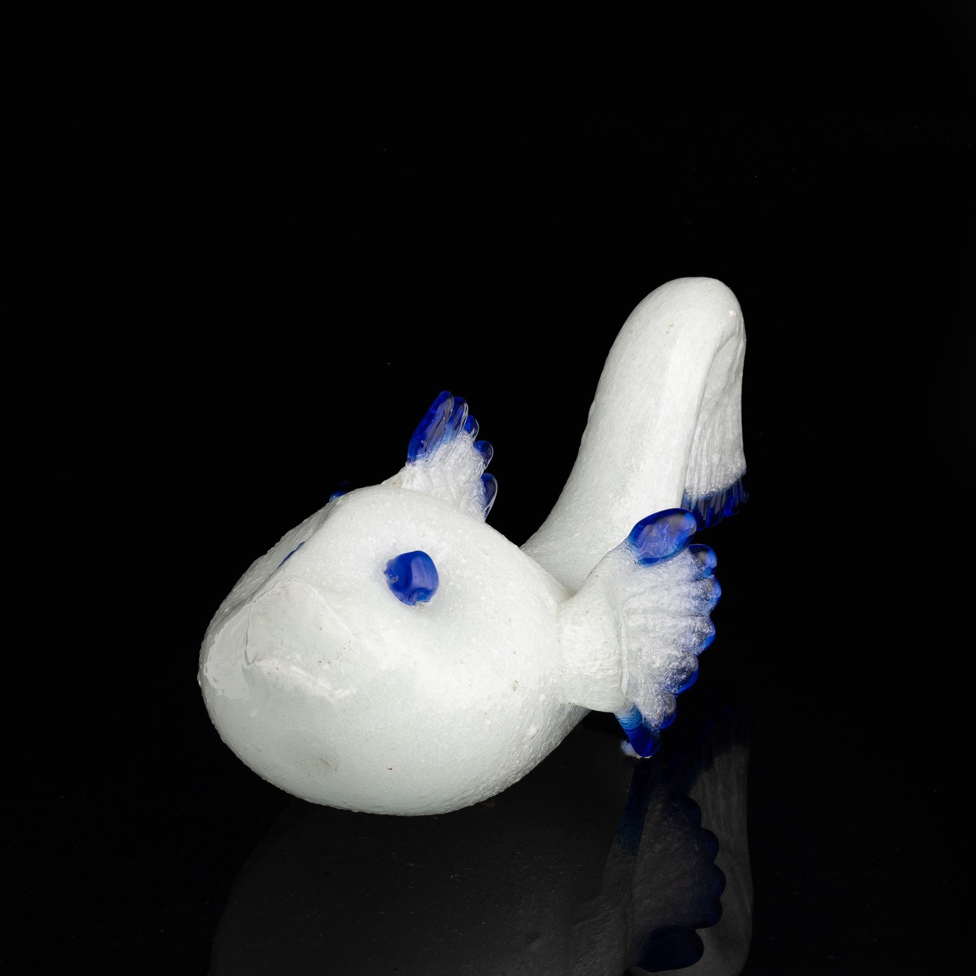 Pesce fantastico in vetro pulegoso lattimo con finiture in vetro trasparente blu.