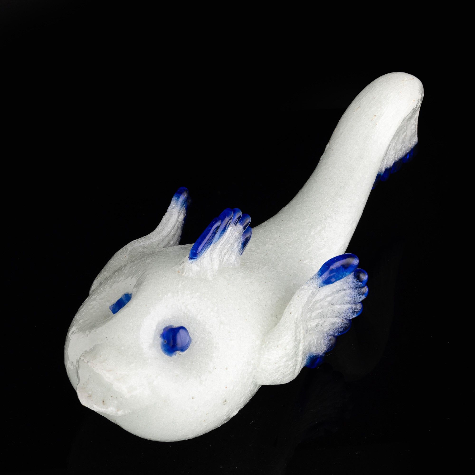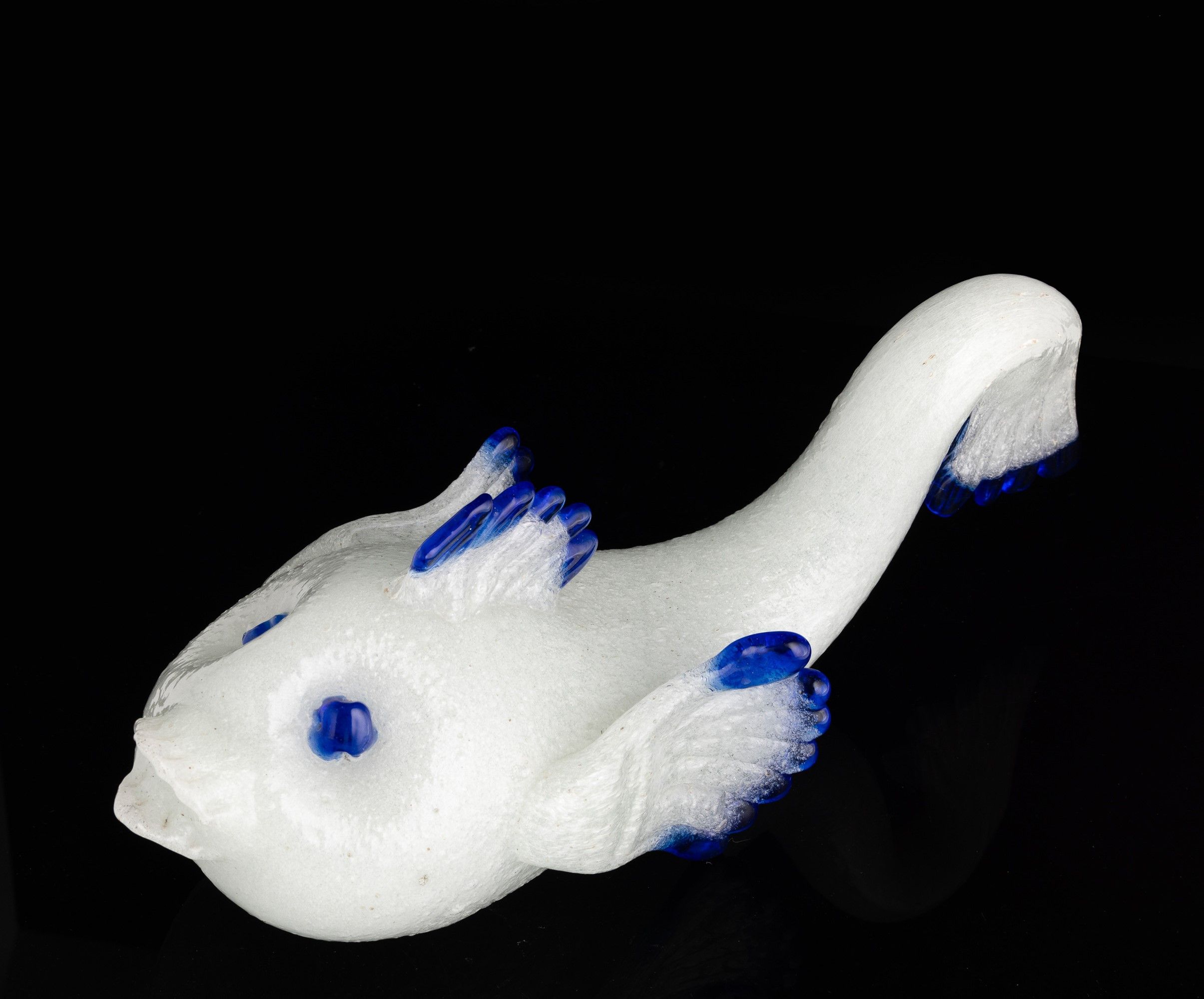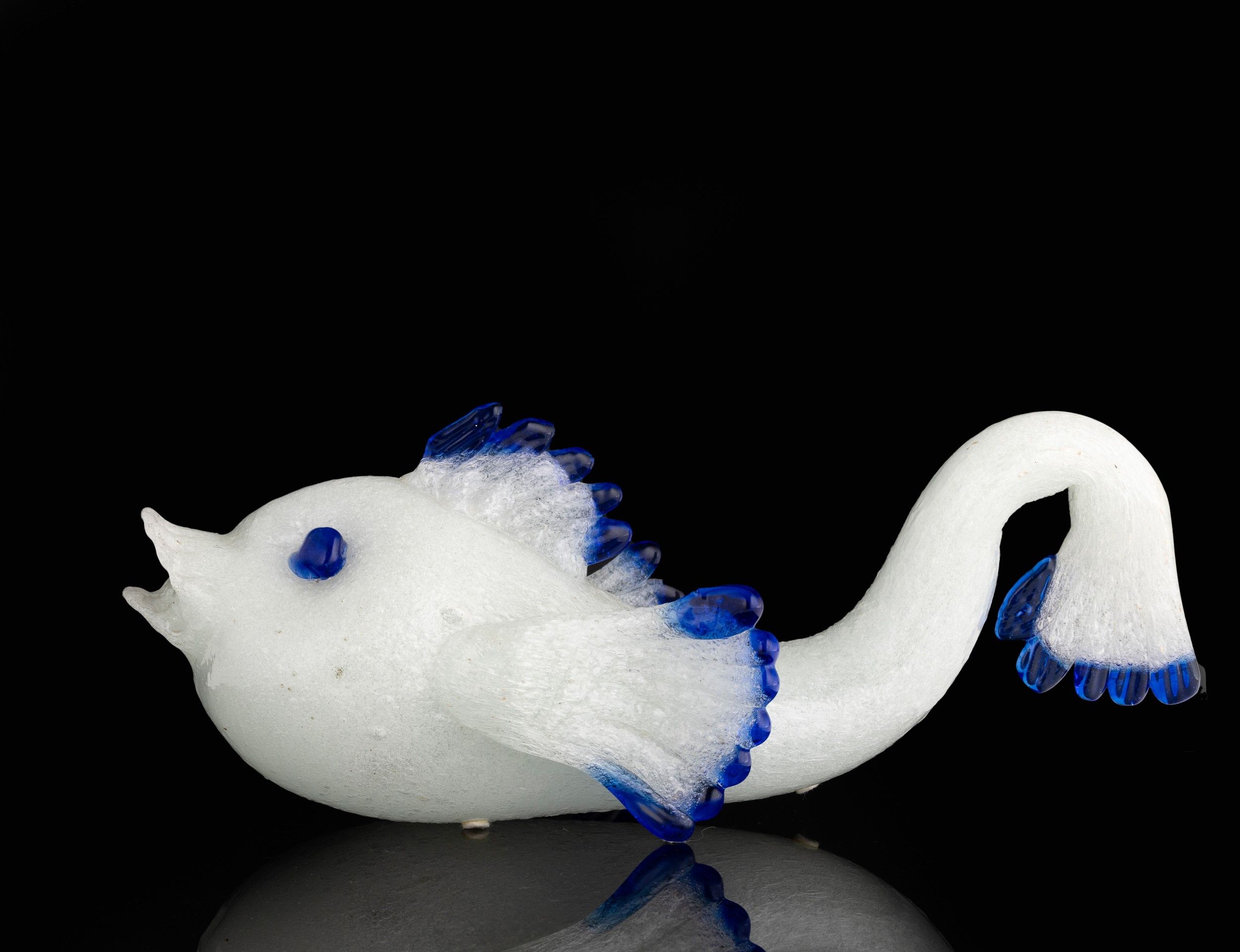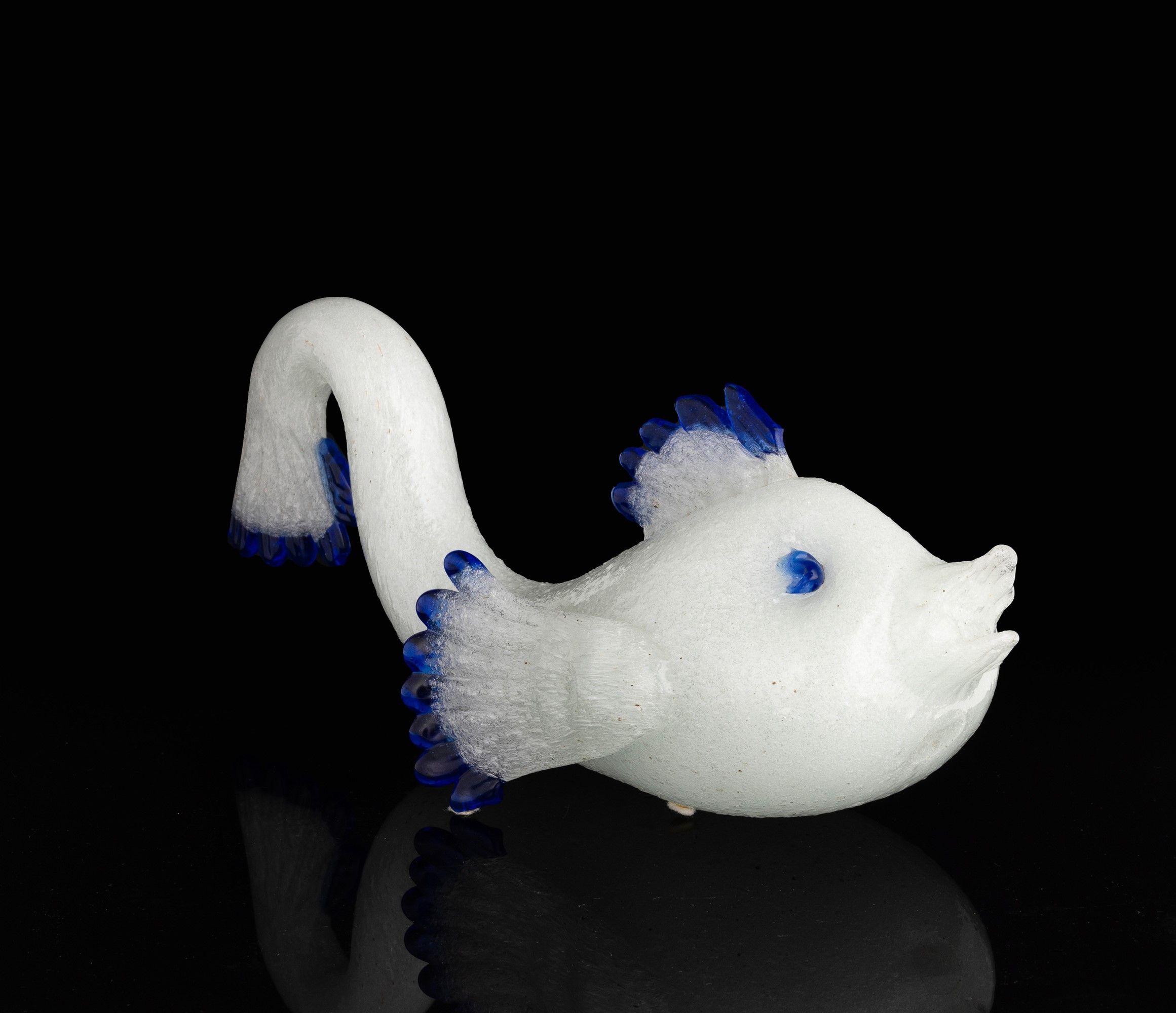 Pesce fantastico in vetro pulegoso lattimo con finiture in vetro trasparente blu.