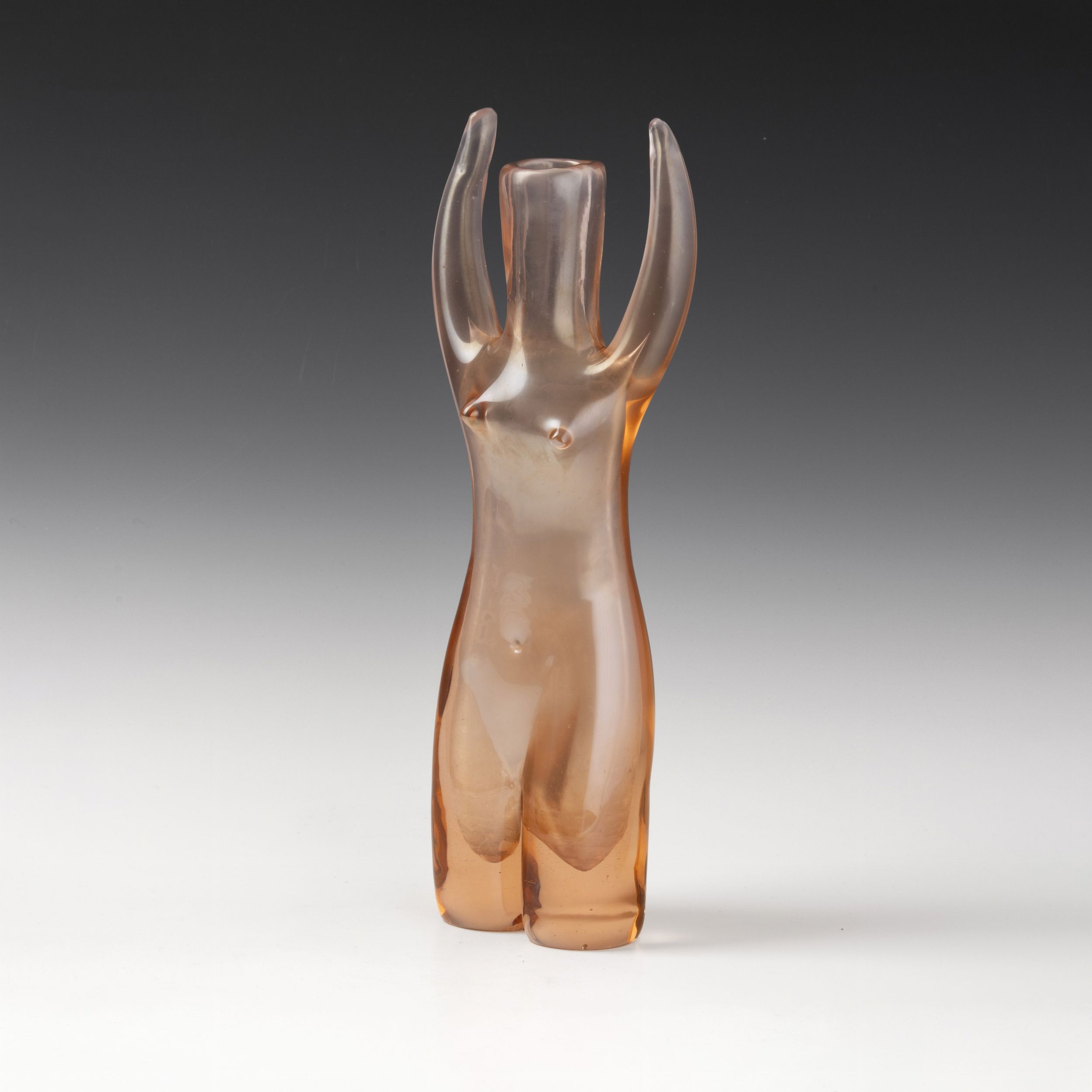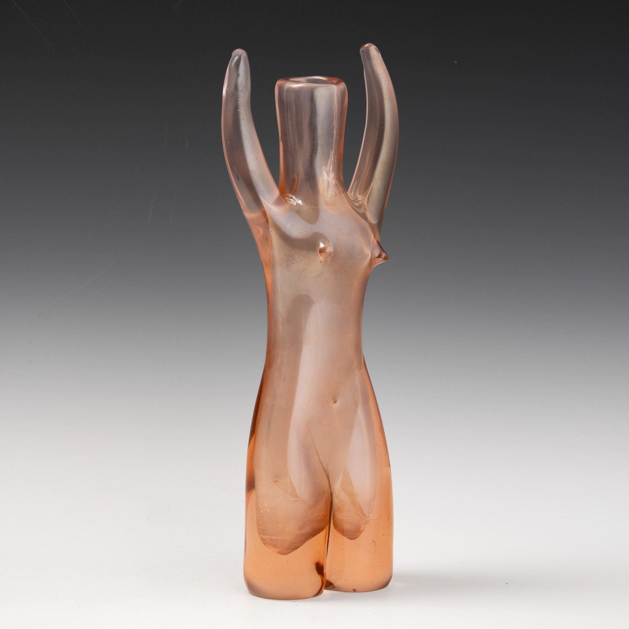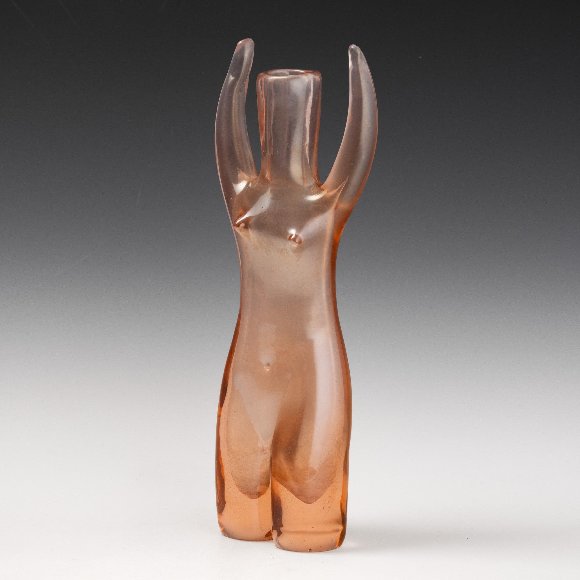 Raro vaso in forma di corpo di donna in vetro soffiato modellato a caldo con superficie leggermente iridata. Firma all'acido Venini Murano Made in Italy.