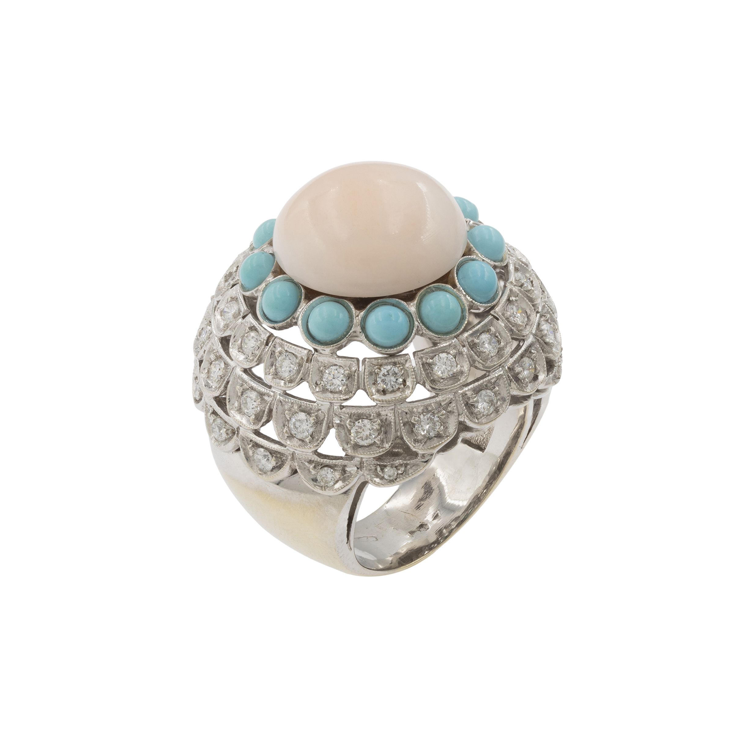 corallo rosa e turchesi taglio cabochon, diamanti taglio brillante ct 1,30 circa, misura 16