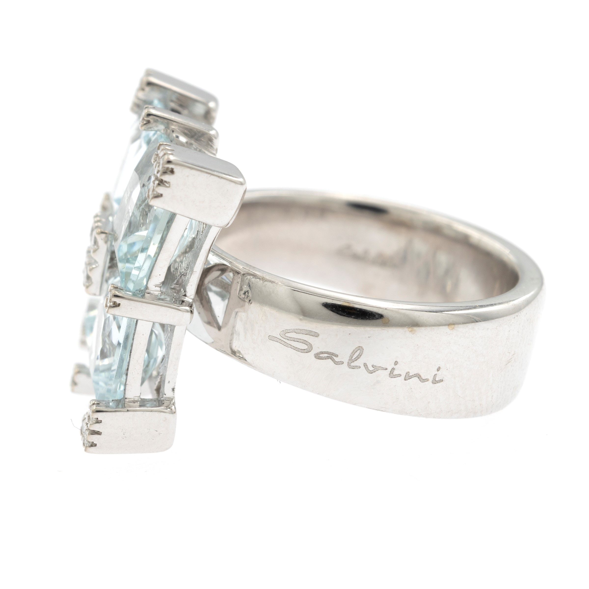 firmato Salvini in oro bianco 18kt, quattro acquamarine taglio carré e diamanti taglio brillante ct 0,16 punti, misura 15,5