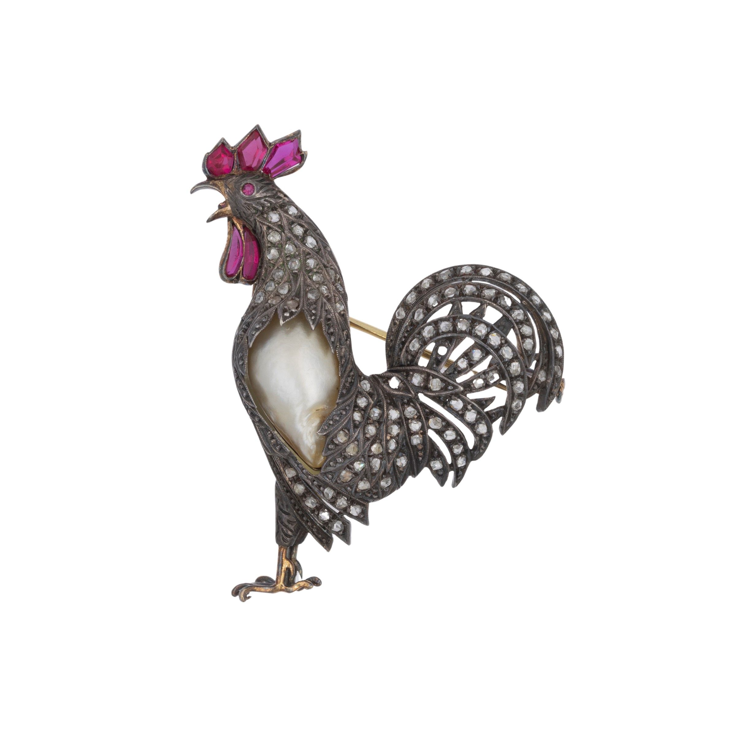 primi '900 rose di diamante, rubini taglio fantasia e perla a goccia, due rose di diamante mancanti, dimensioni 4,8x3,3 cm.