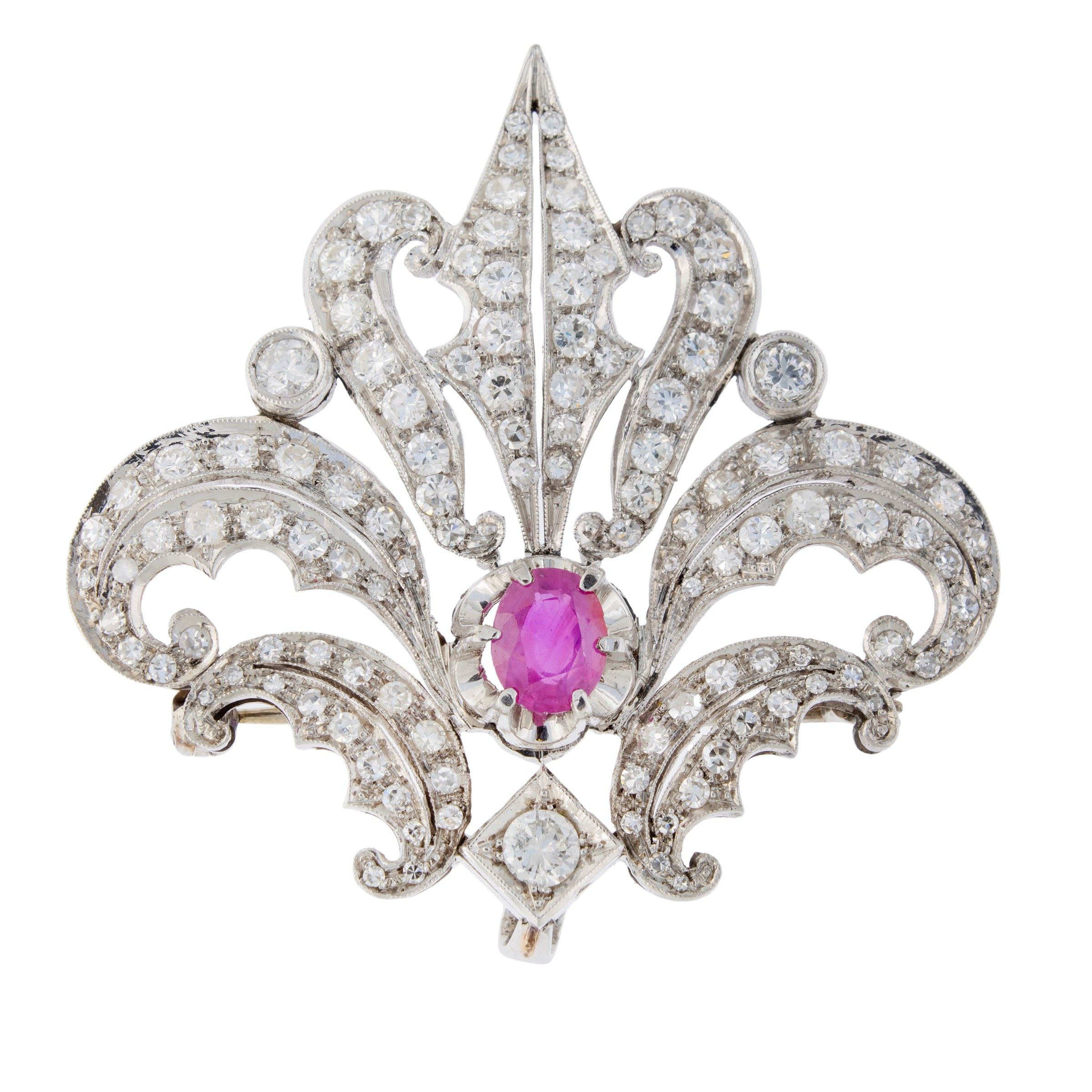 Antica spilla in oro bianco 18kt con rubino e diamanti