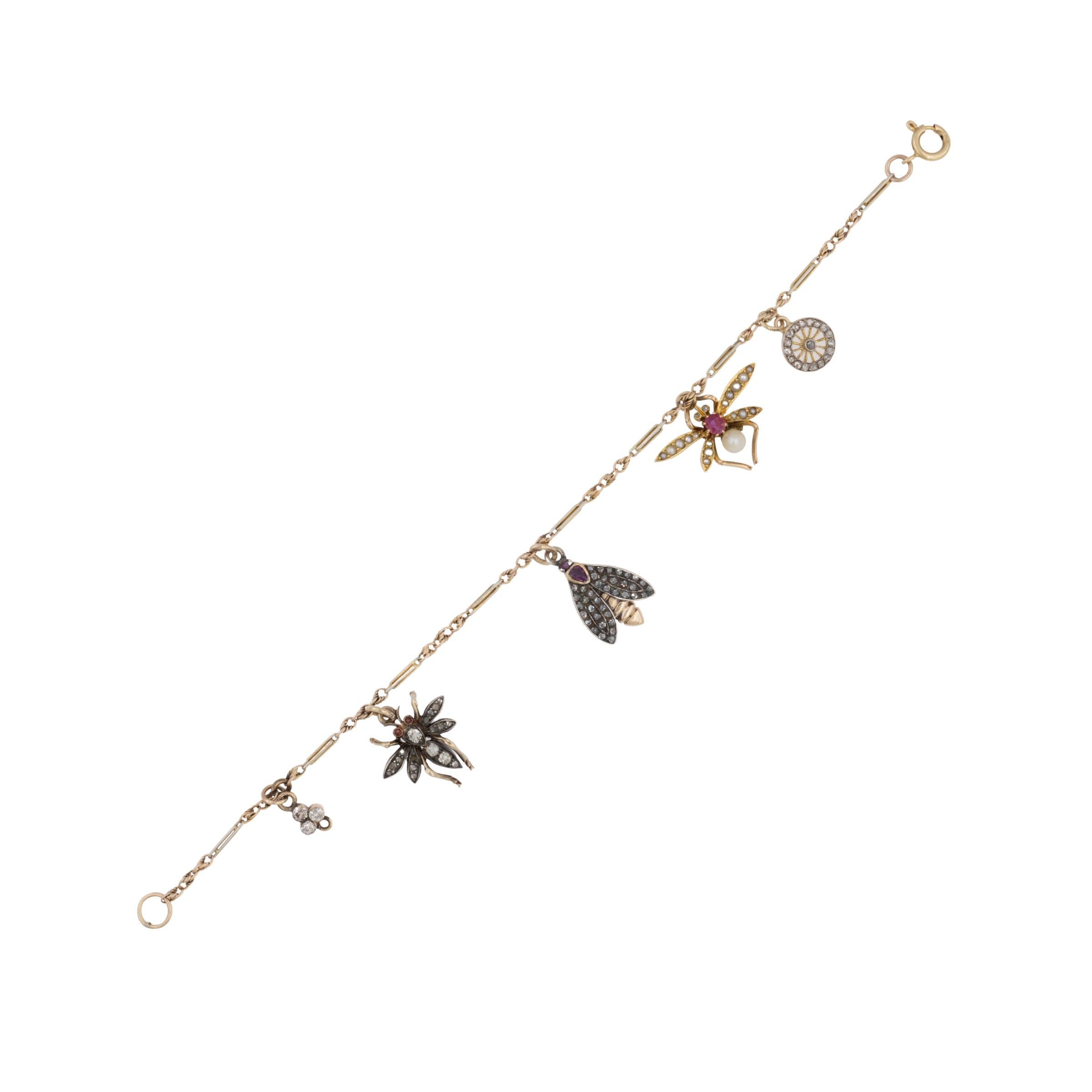 primi '900 cinque charms fogge e misure diverse in oro, argento, rose coroné, rose di diamante, rubini, perline, lunghezza 18 cm.