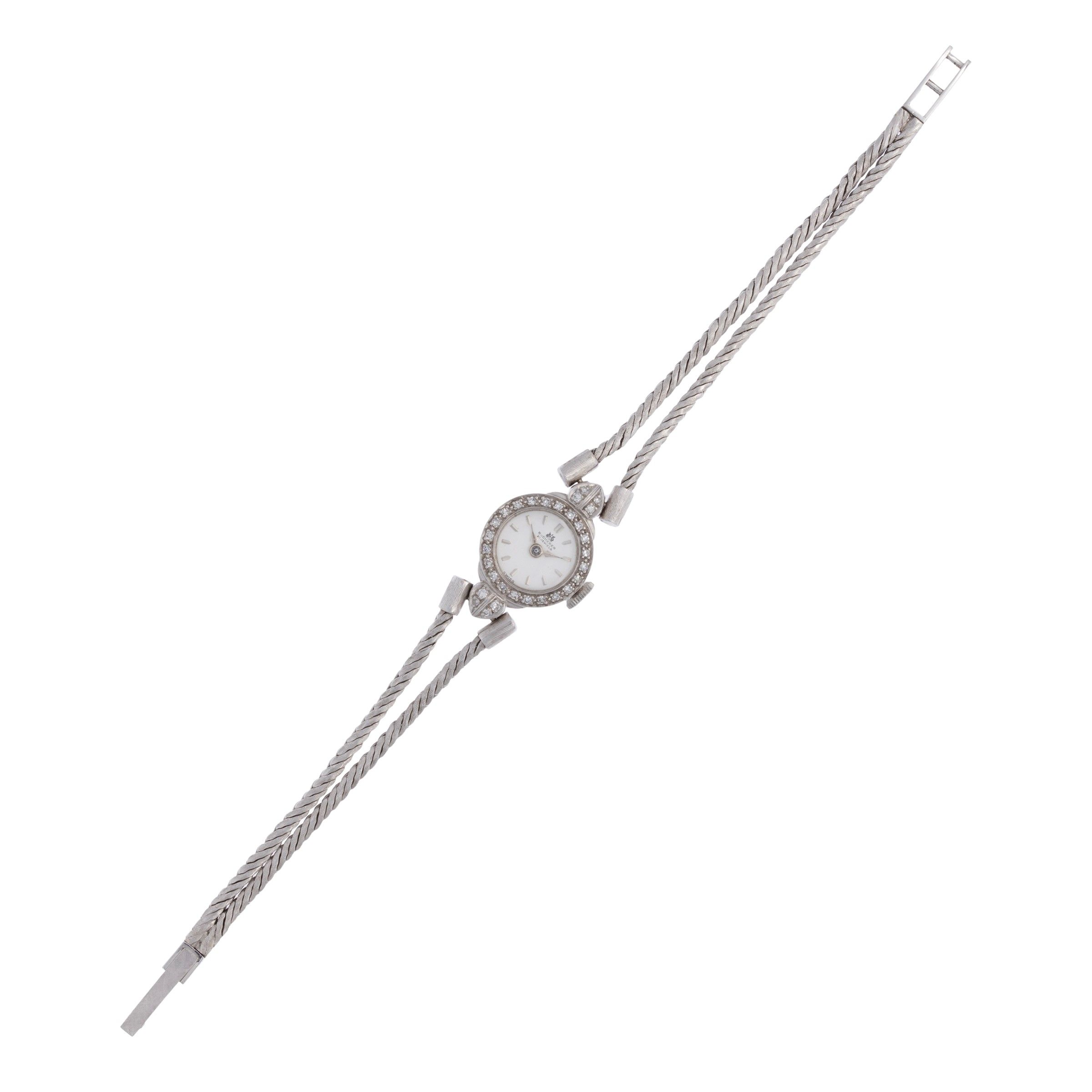 peso 19 gr. anni 40/50 in oro bianco 18kt, ref. 21449, cassa tonda 15 mm. con diamanti taglio huit-huit, quadrante argentato con indici, vetro zaffiro, movimento meccanico a carica manuale, bracciale originale in oro bianco 18kt a cordoncino, lunghezza 17 cm. completo di scatola