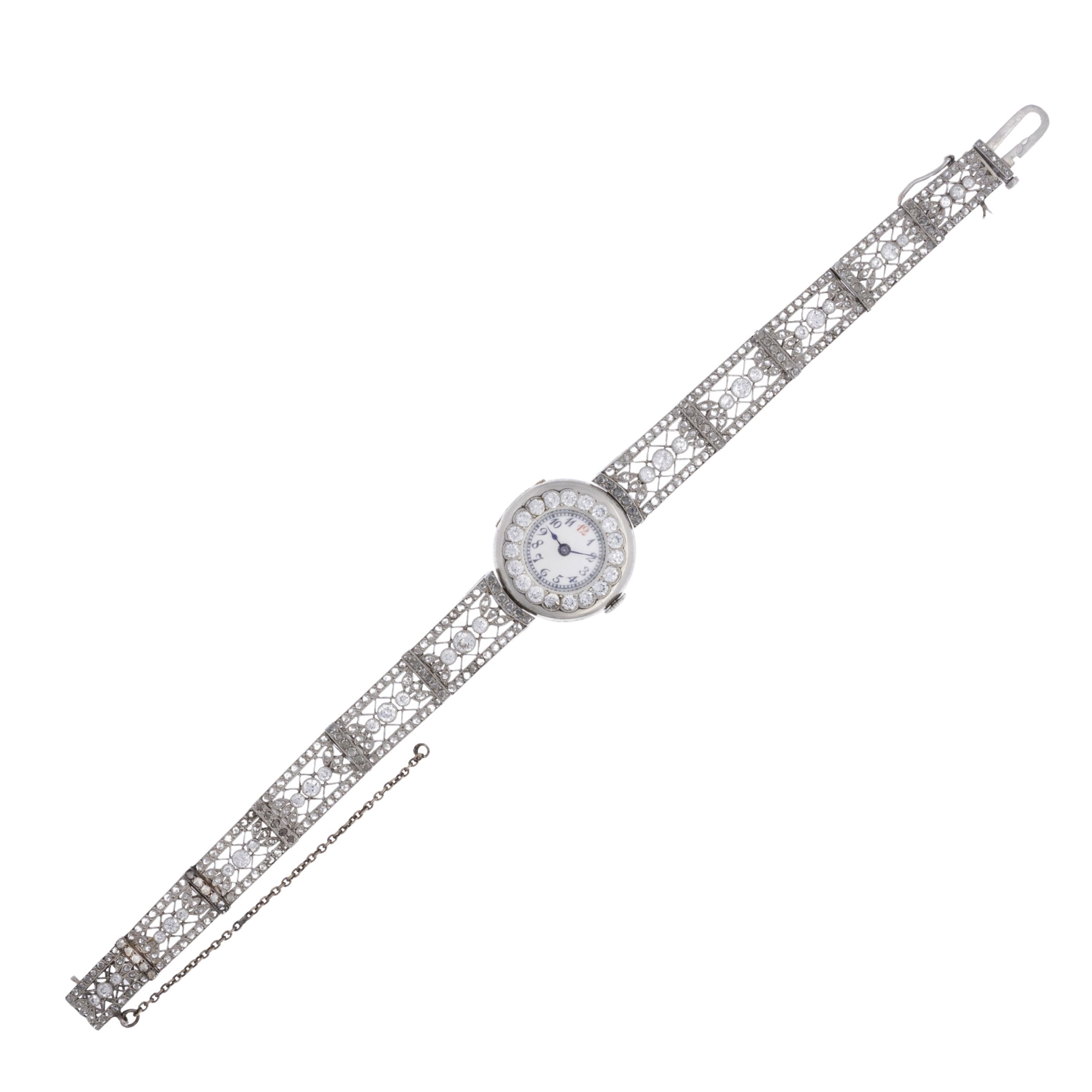 primi' 900 taglio brillante antico ct 2,80 e rose di diamante, chiusura a scatto, orologio non funzionante, lunghezza 19 cm.