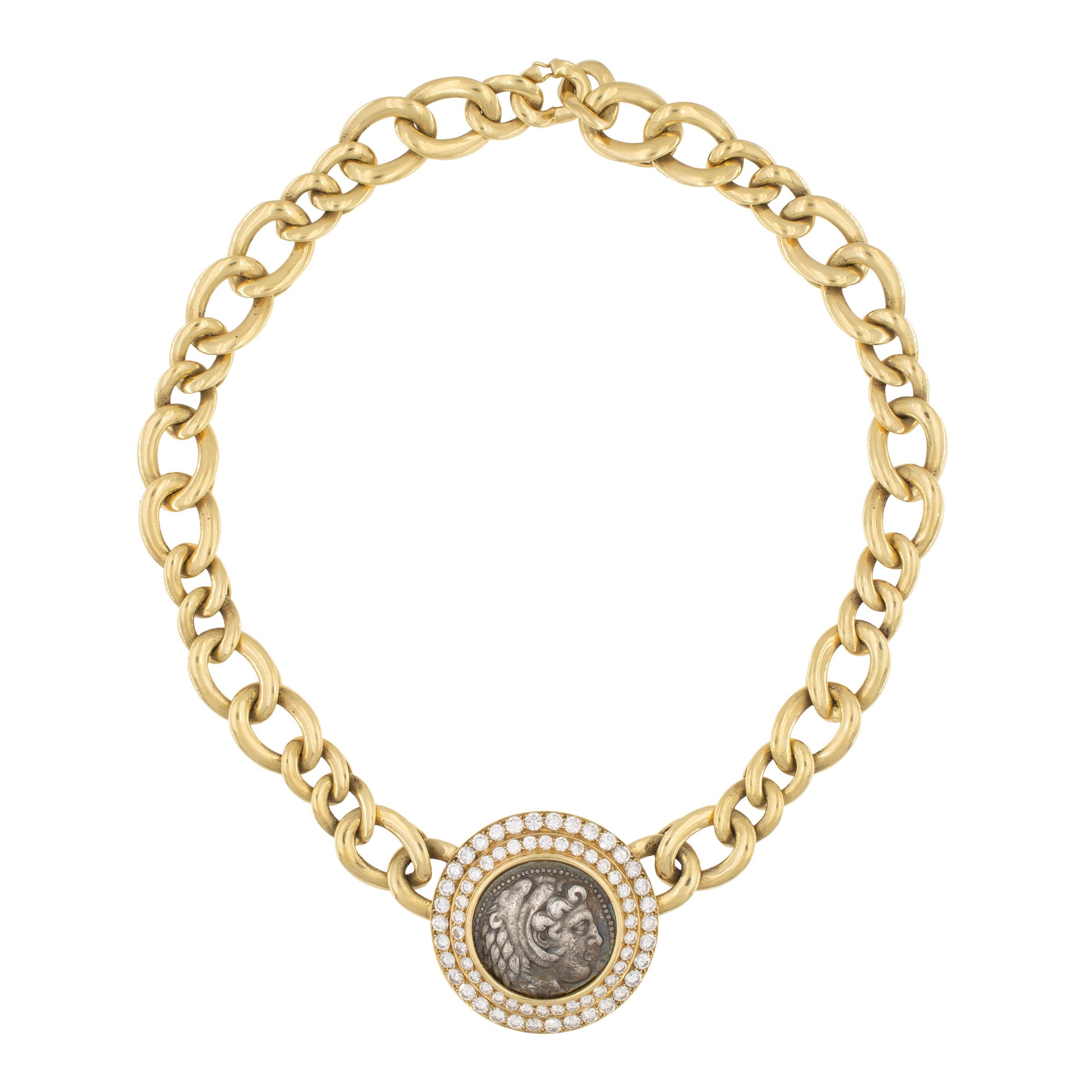 firmata, anni 70/80 in oro giallo 18kt con moneta raffigurante Alessandro Magno contornata da diamanti taglio brillante ct 5 circa, lunghezza 41 cm. Bibliografia di riferimento per modelli simili: catalogo della mostra Tra Eternità e Storia Bvlgari dal 1884 al 2009, 125 anni di Gioielli italiani, Roma, Palazzo delle Esposizioni 22 maggio - 13 settembre 2009, a cura di Amanda Triossi, Skira, Roma, 2009, pag. 338 - 339