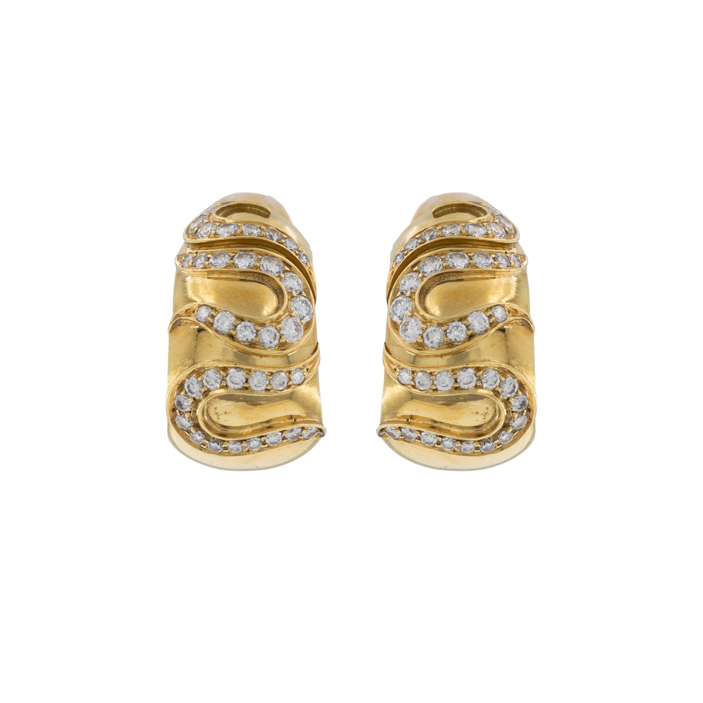 firmati, anni 70 circa in oro giallo 18kt e diamanti taglio brillante ct 1,80 circa, dimensioni 2,5x1,30 cm.