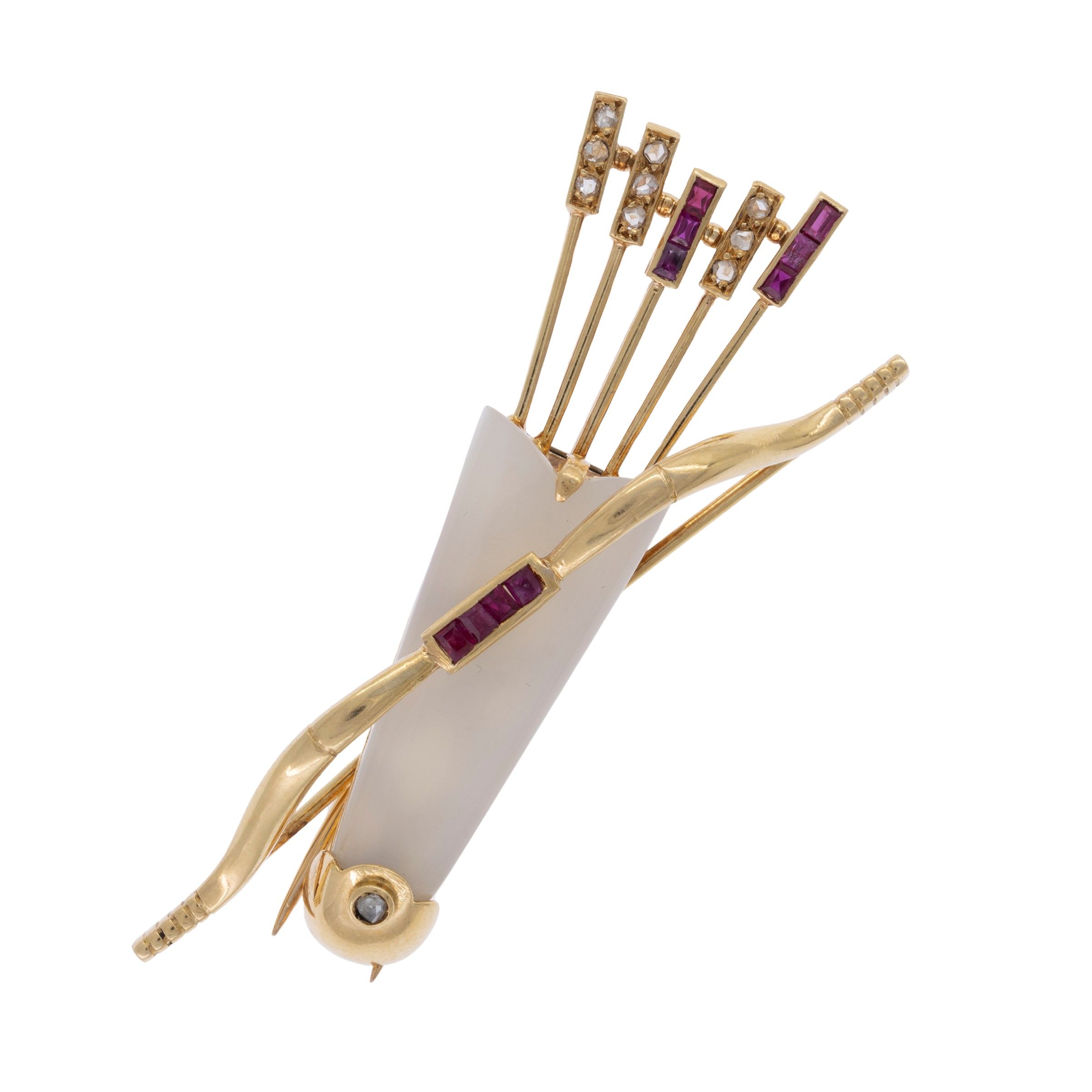firmata e numerata in oro giallo 18kt, calcedonio, rose di diamante e rubini carré, modellata a foggia di arco con faretra di frecce, dimensioni 4,7x2 cm.