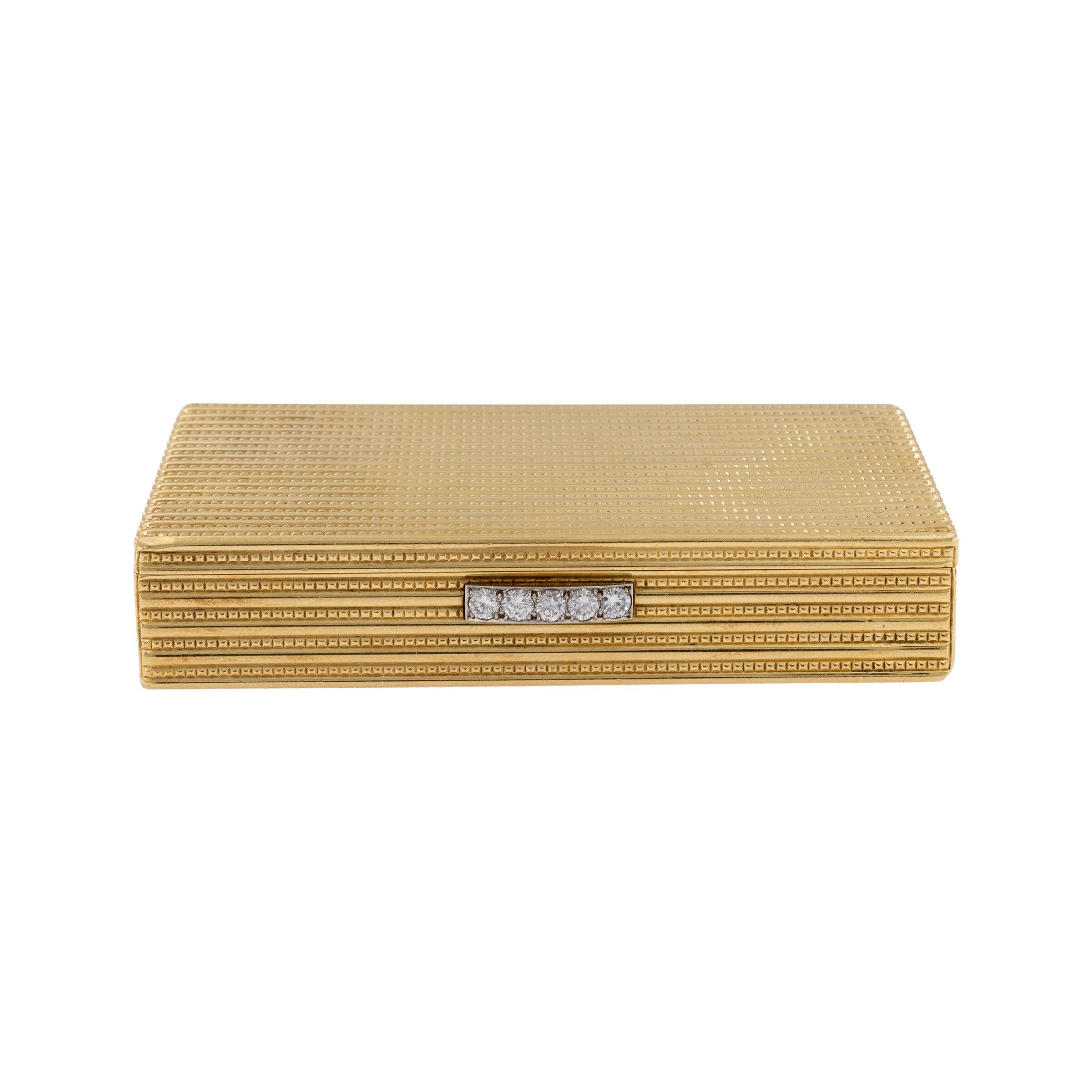 firmata, reca bolli inglesi chiusura a scatto impreziosita da diamanti taglio brillante ct 0,50 circa, dimensioni 8,9x6x1,6 cm.