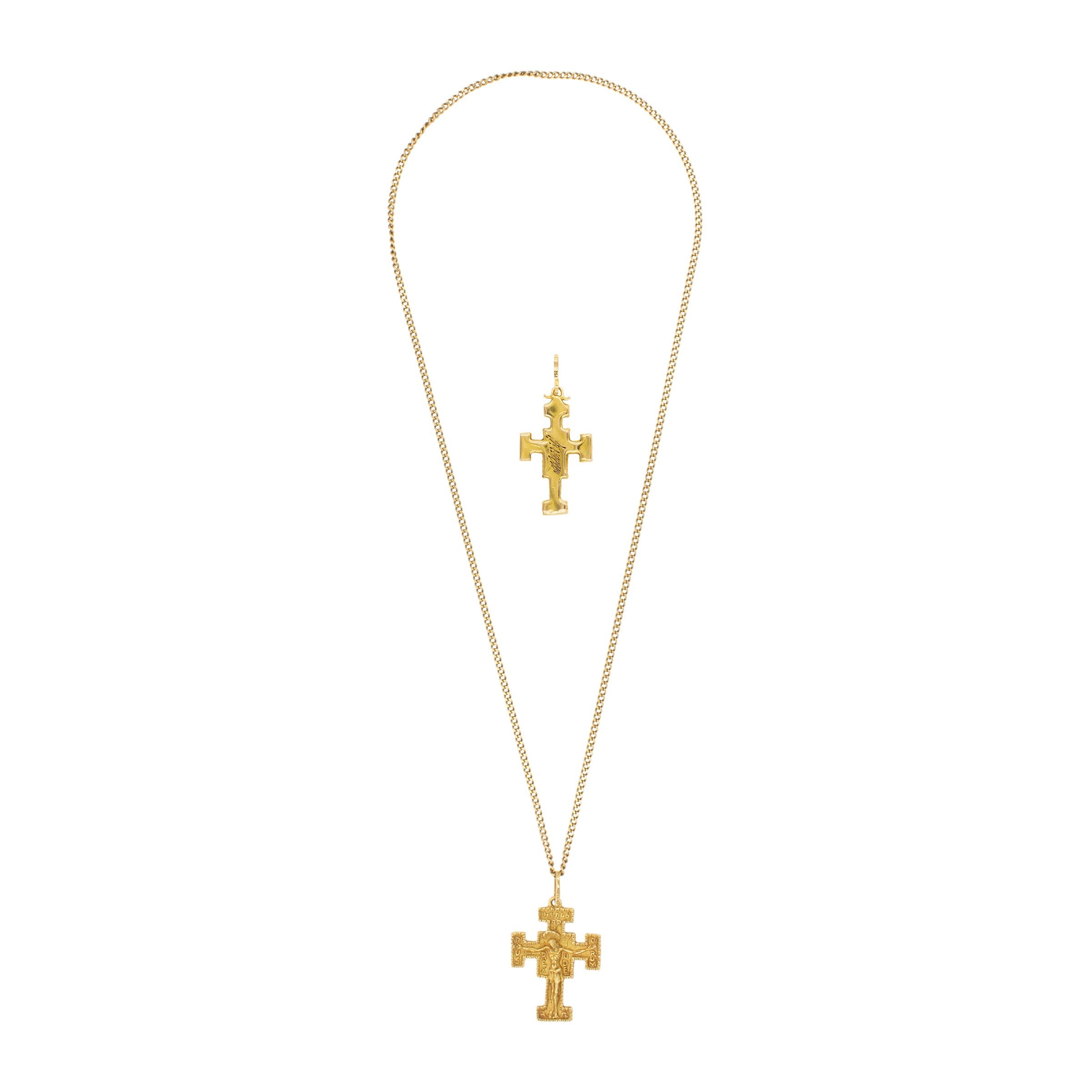 firmate sbalzato ed inciso, un pendente Croce aggiuntivo in oro giallo liscio, lunghezza collana 66 cm. - Croce grande 4,5 cm. - Croce piccola 3,7 cm.