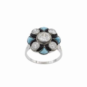 peso 22 gr. corallo rosa e turchesi taglio cabochon, diamanti taglio brillante ct 1,30 circa, misura 16
