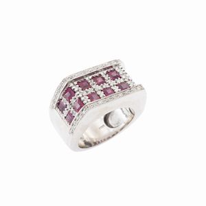 peso 11,50 gr. diamanti taglio brillante ct 0,80 circa, rubini tondi ct 0,60 circa, misura 13