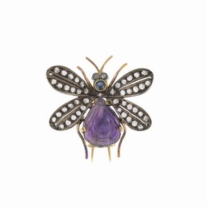 peso 12 gr. primi '900 ametista a goccia intagliata, zaffiro tondo e rose di diamante, dimensioni 3,7x3,8 cm.