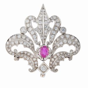 Antica spilla in oro bianco 18kt con rubino e diamanti