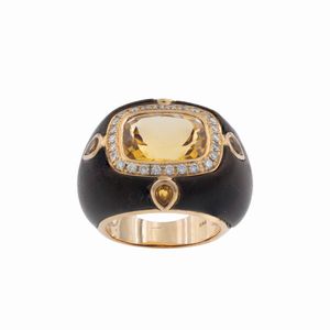 Anello in oro giallo 18kt legno quarzo citrino e diamanti