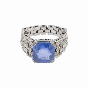 peso 7 gr. anni 50/60 zaffiro ct 5 circa taglio ovale misto contornato da diamanti taglio brillante ct 1,80 circa, [..]