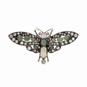 peso 15 gr. anni 40/50 diamanti taglio brillante e rose coroné ct 0,50 circa, smeraldi taglio carré e occhi con [..]