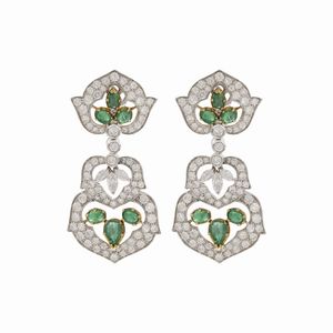peso 28 gr. anni 70/80 diamanti taglio brillante e marquise ct 6 circa, smeraldi taglio ovale e a goccia ct 4 [..]