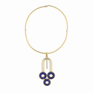 peso 40 gr. anni 70 circa in oro a due colori 18kt, diamanti e sezioni circolari in lapislazzulo, lunghezza collana [..]