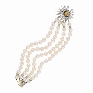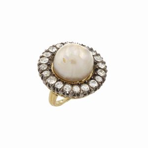 peso 18 gr. primi '900 taglio brillante antico ct 2 circa, perla 14 mm. circa, misura 3