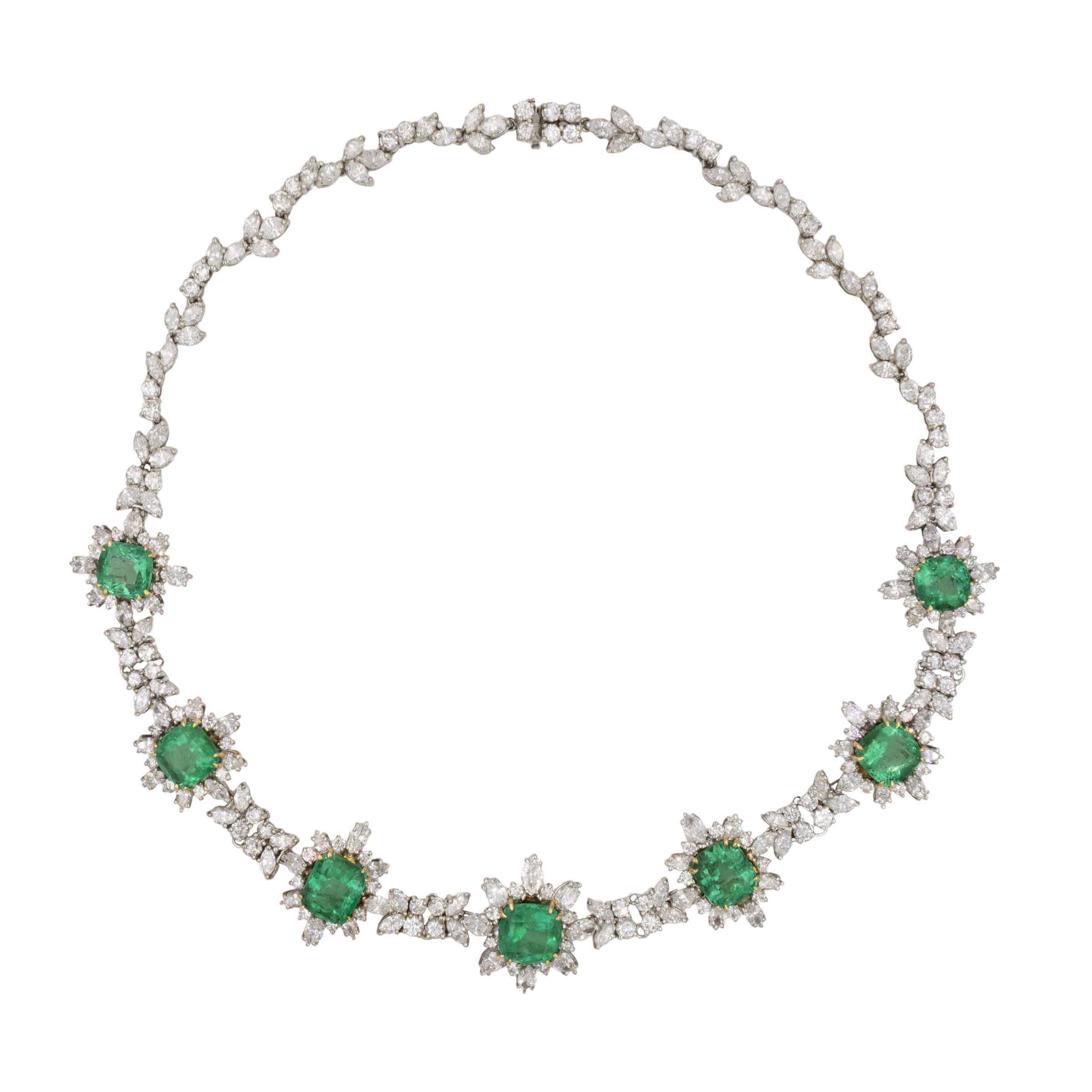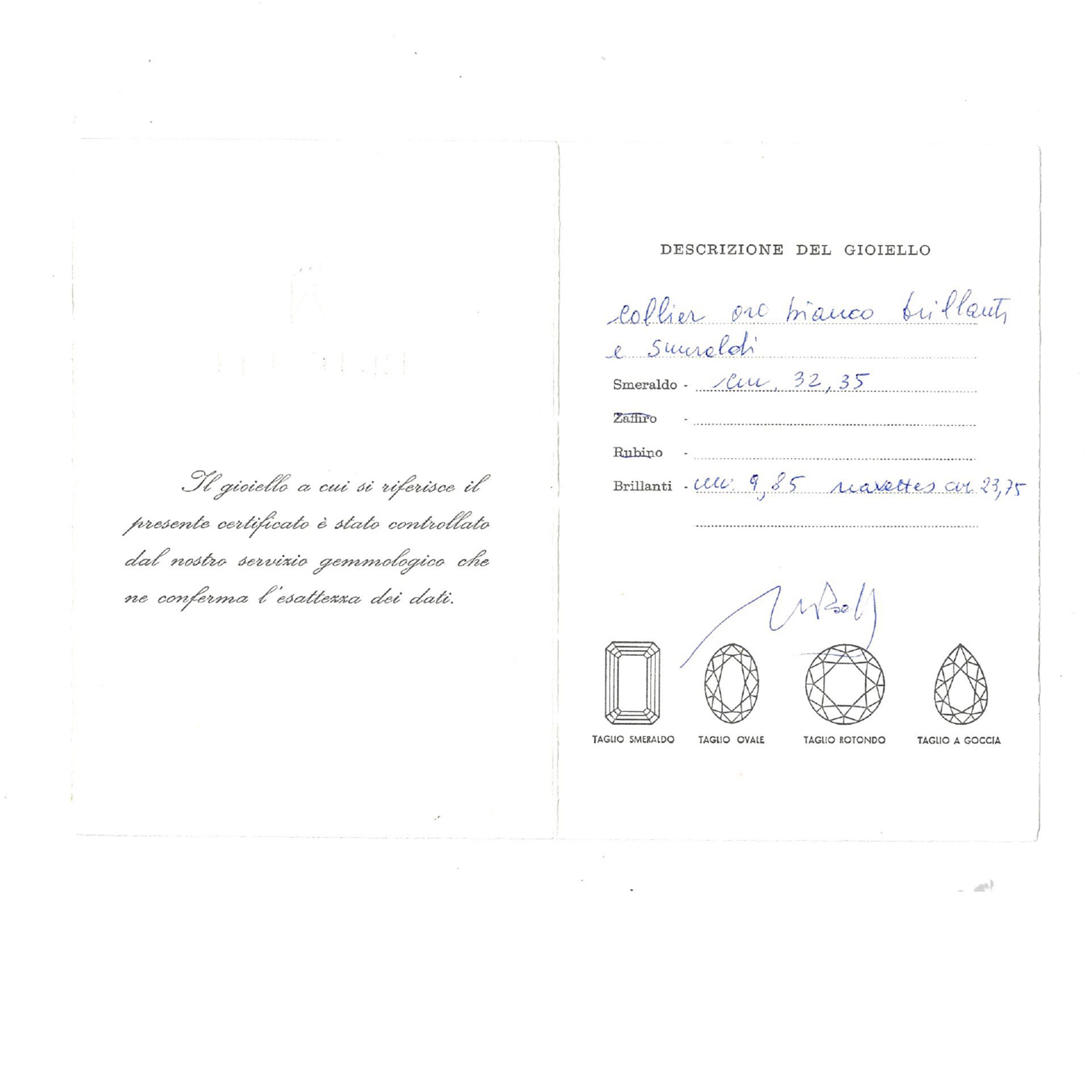 provenienza Bedetti Roma sette smeraldi taglio a cuscino misto ct 32,35 circa, privi di trattamento termico, alternati da diamanti taglio navette ct 19,75, diamanti taglio brillante ct 9,85 circa e diamanti taglio a goccia ct 4,50, colore G/H - purezza VVS/SI, montata in oro bianco e giallo 14kt, lunghezza 44 cm. completa di scatola e certificato gemmologico