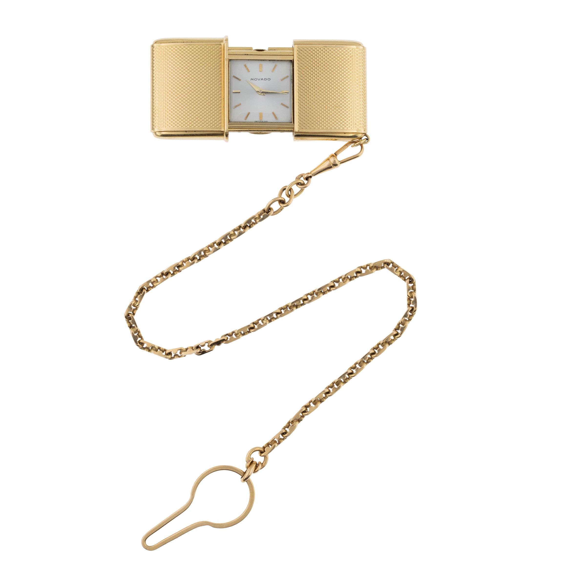 peso 86 gr. anni 40/50 in oro giallo 18kt, ref. 165 - 3266, dimensioni 45x31 mm. quadrante argentato con indici a scomparsa, movimento meccanico a carica manuale che avviene attraverso la chiusura e apertura della custodia, calibro 105, completo di catena orologio in oro giallo 18kt, lunghezza 30 cm.