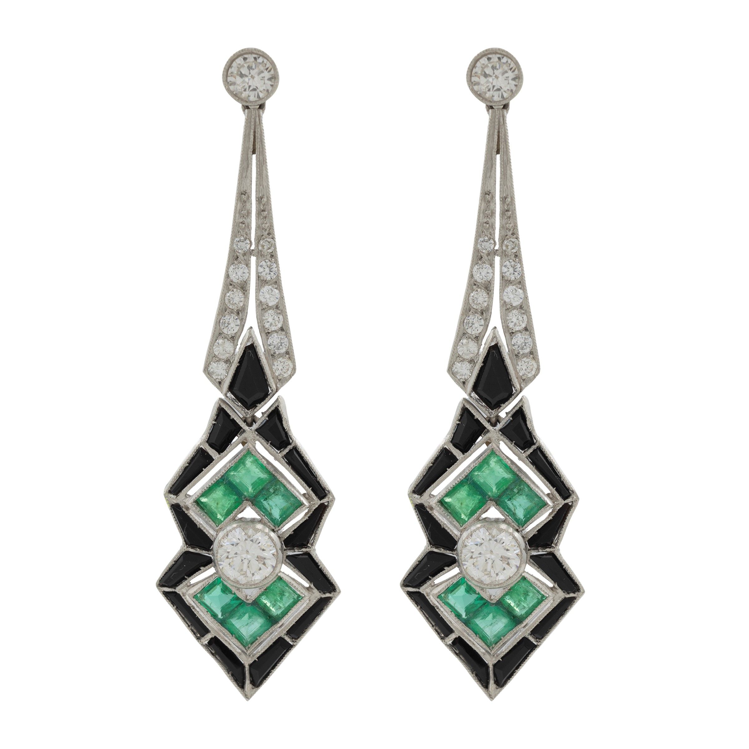 Orecchini Decò in platino diamanti smeraldi e onice nero