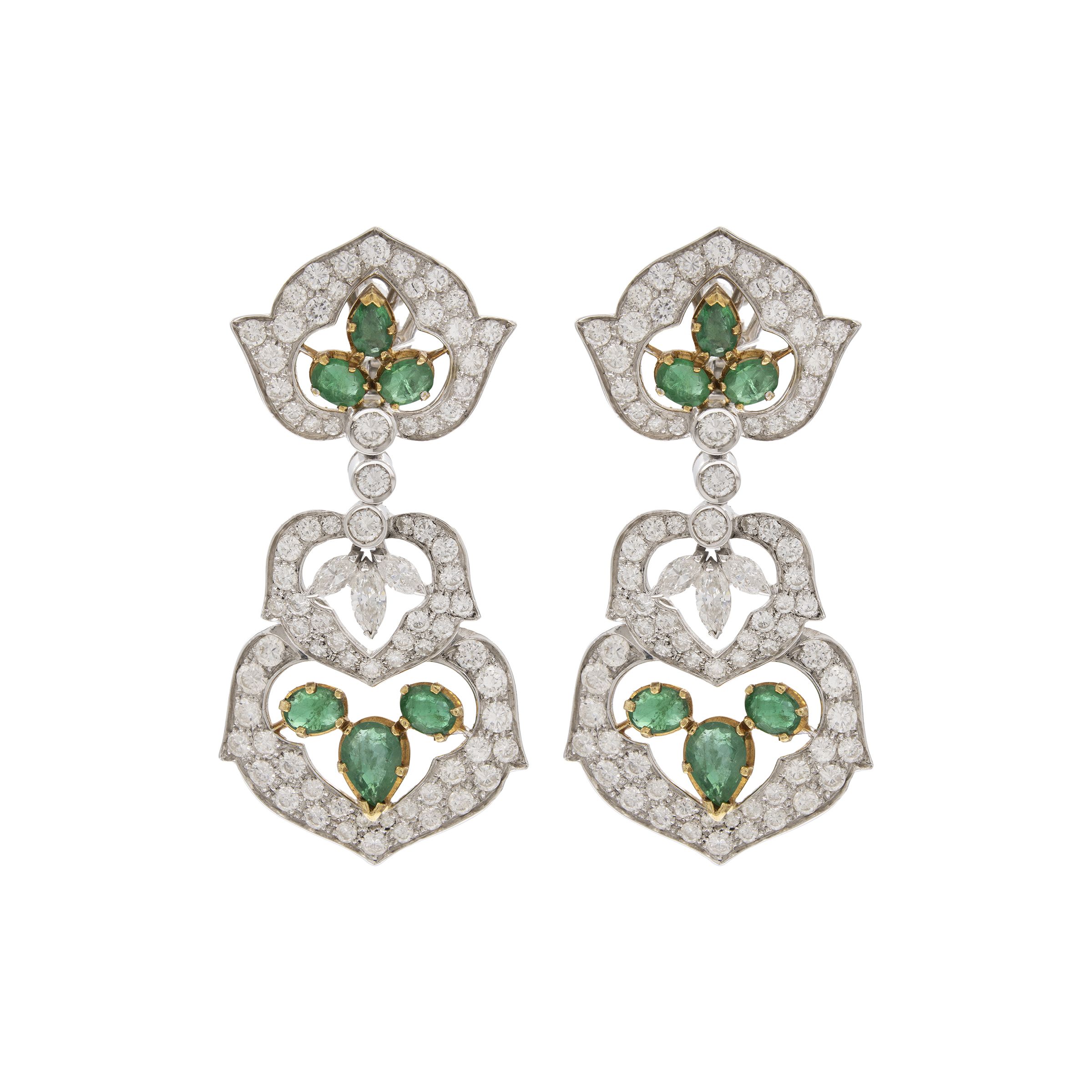 anni 70/80 diamanti taglio brillante e marquise ct 6 circa, smeraldi taglio ovale e a goccia ct 4 circa, lunghezza 6 cm.
