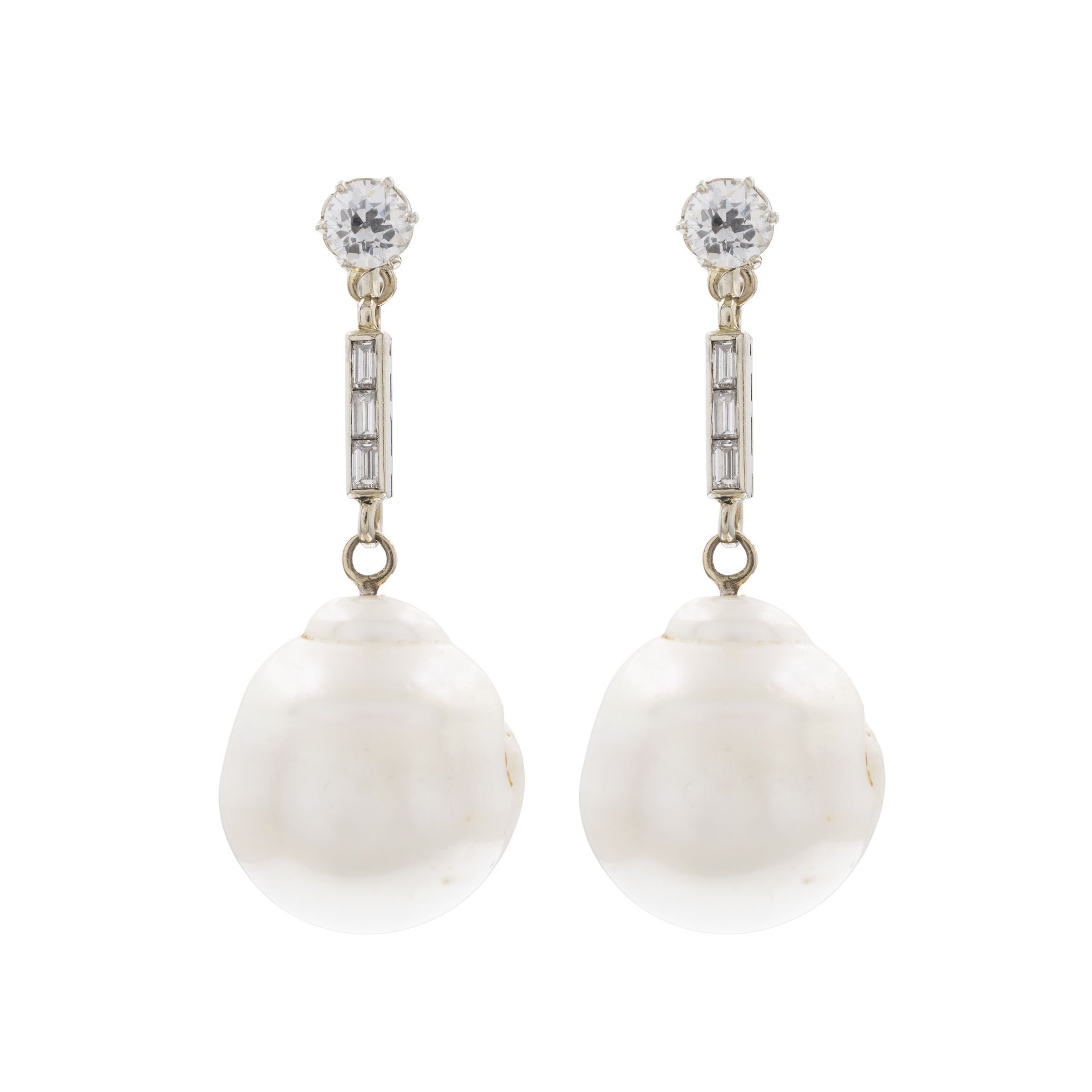 anni 40/50 taglio brillante antico e baguette ct 1,20 circa, perle pendenti removibili 17 mm. circa, lunghezza 4,3 cm.