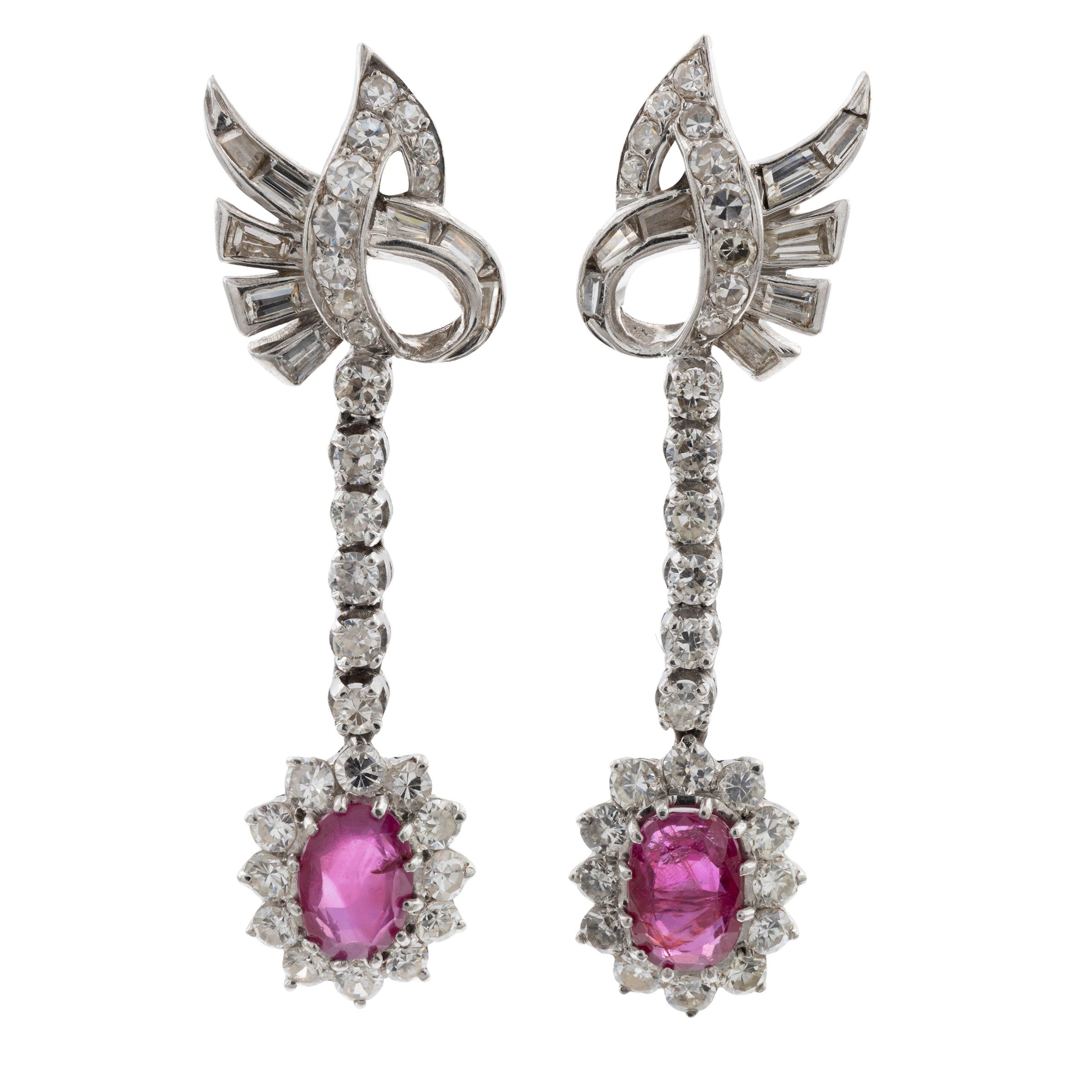 anni 40/50 due rubini taglio ovale misto ct 2 circa, diamanti taglio brillante e baguette ct 2 circa, lunghezza 4,3 cm.