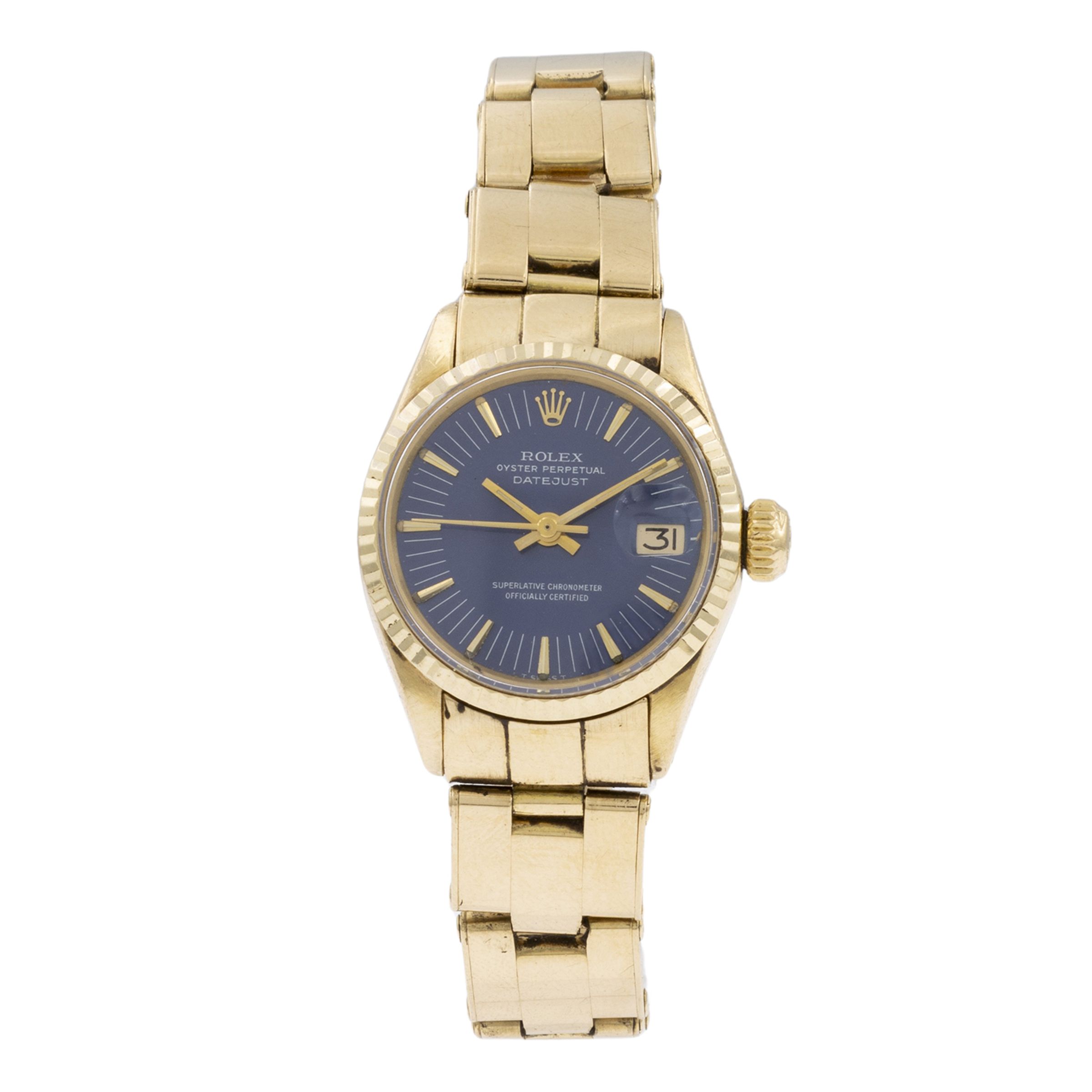 peso 57 gr. anni 70 circa in oro giallo 18kt, ref. 6516 - 2658508, cassa 26 mm. quadrante blu con indici, datario ore 3, movimento meccanico a carica automatica, calibro 1161 bracciale oyster in oro giallo 18kt con chiusura deployante, cassa,quadrante e movimento firmati