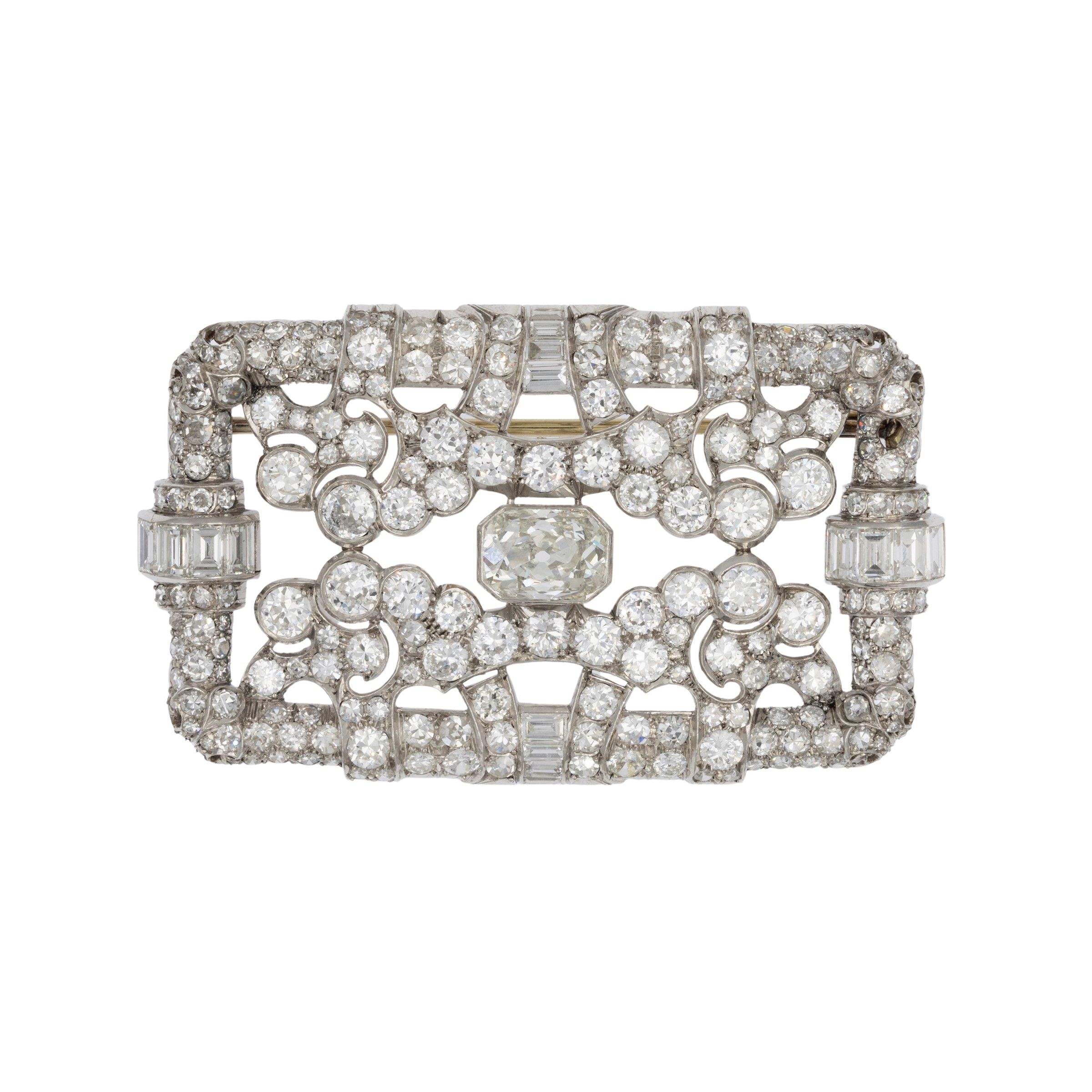 un diamante taglio a cuscino ct 2 circa contornato da diamanti taglio brillante e baguettes ct 6 circa, un diamante mancante, dimensioni 5,5x3,3 cm. completo di cacciavite per montare la susta della spilla