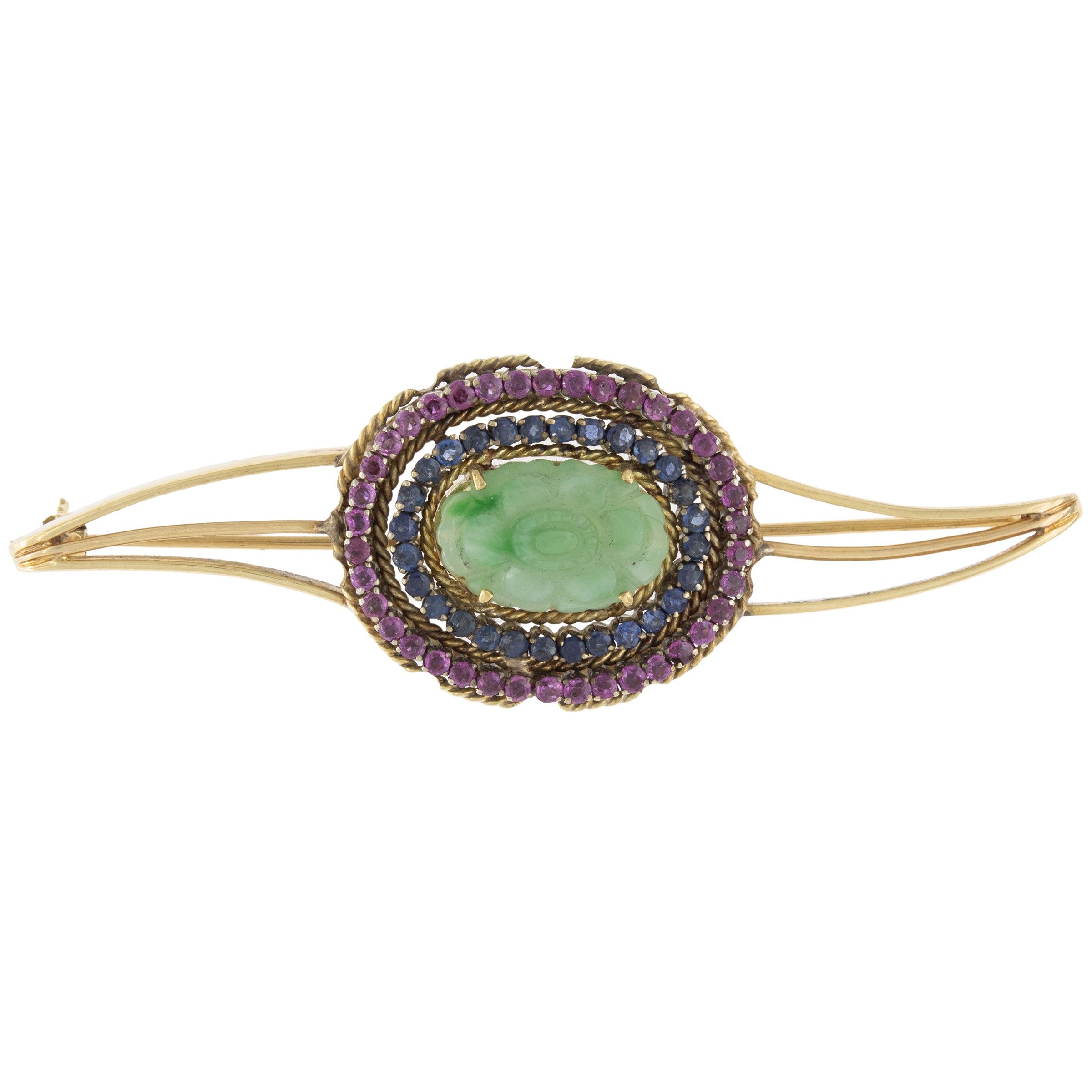 Spilla in oro giallo 18kt e giada scolpita a motivo floreale