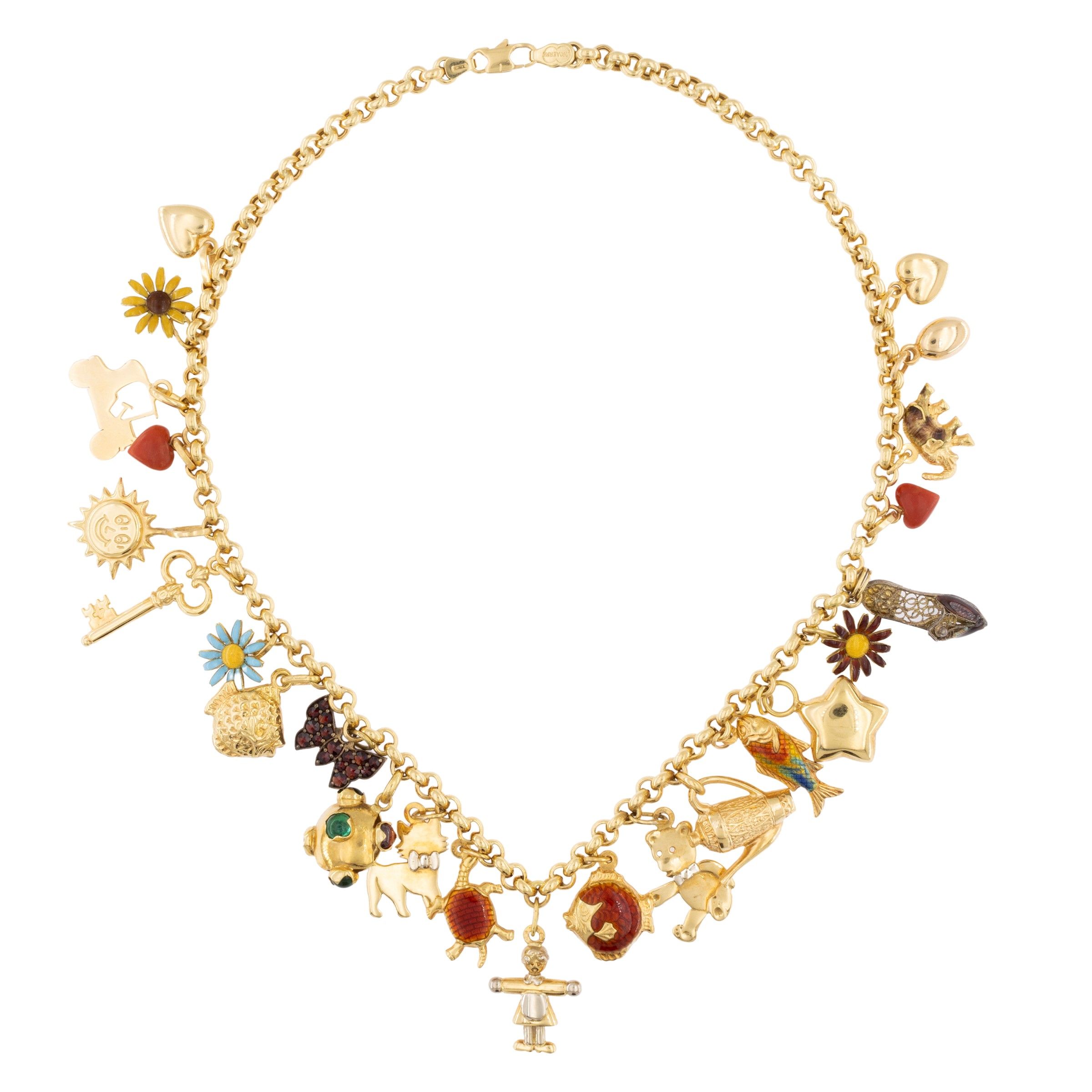 firmata ventidue charms in oro giallo 18kt smalti policromi, corallo e paste vitree e due charms in metallo dorato granati e smalto, lunghezza 43 cm.