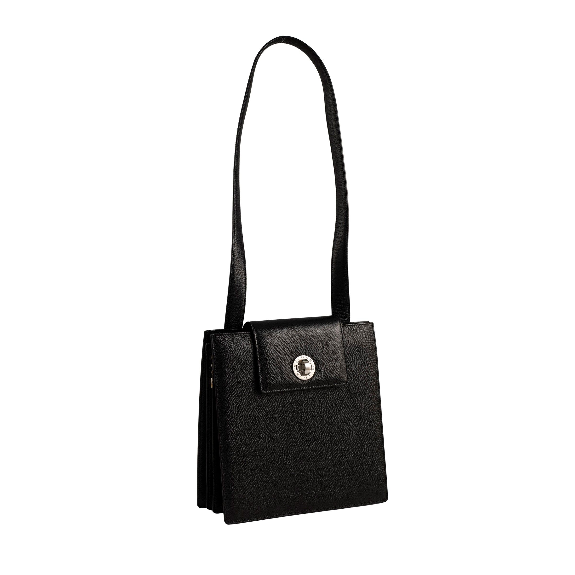 anni 2000 in pelle nera, finiture argentate, interno in tessuto a tre scomparti di cui uno a cerniera ed una tasca interna a zip, chiusura girevole, completa di dust bag, condizioni molto buone