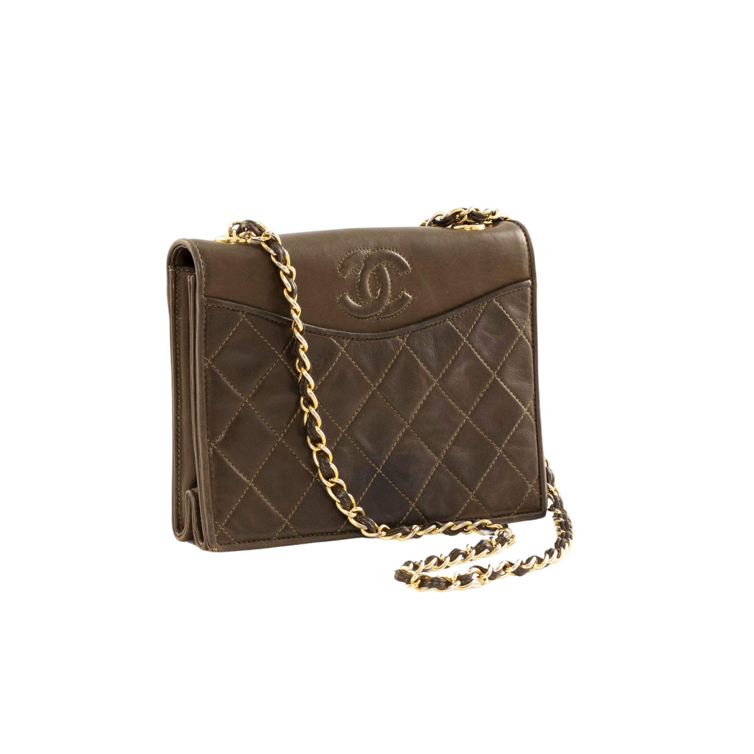 anni 90 circa in pelle verde, finiture dorate, interno in pelle ad uno scomparto con una tasca a cerniera e due tasche esterne, chiusura a patta con logo, tracolla a catena e pelle, alcuni segni di usura