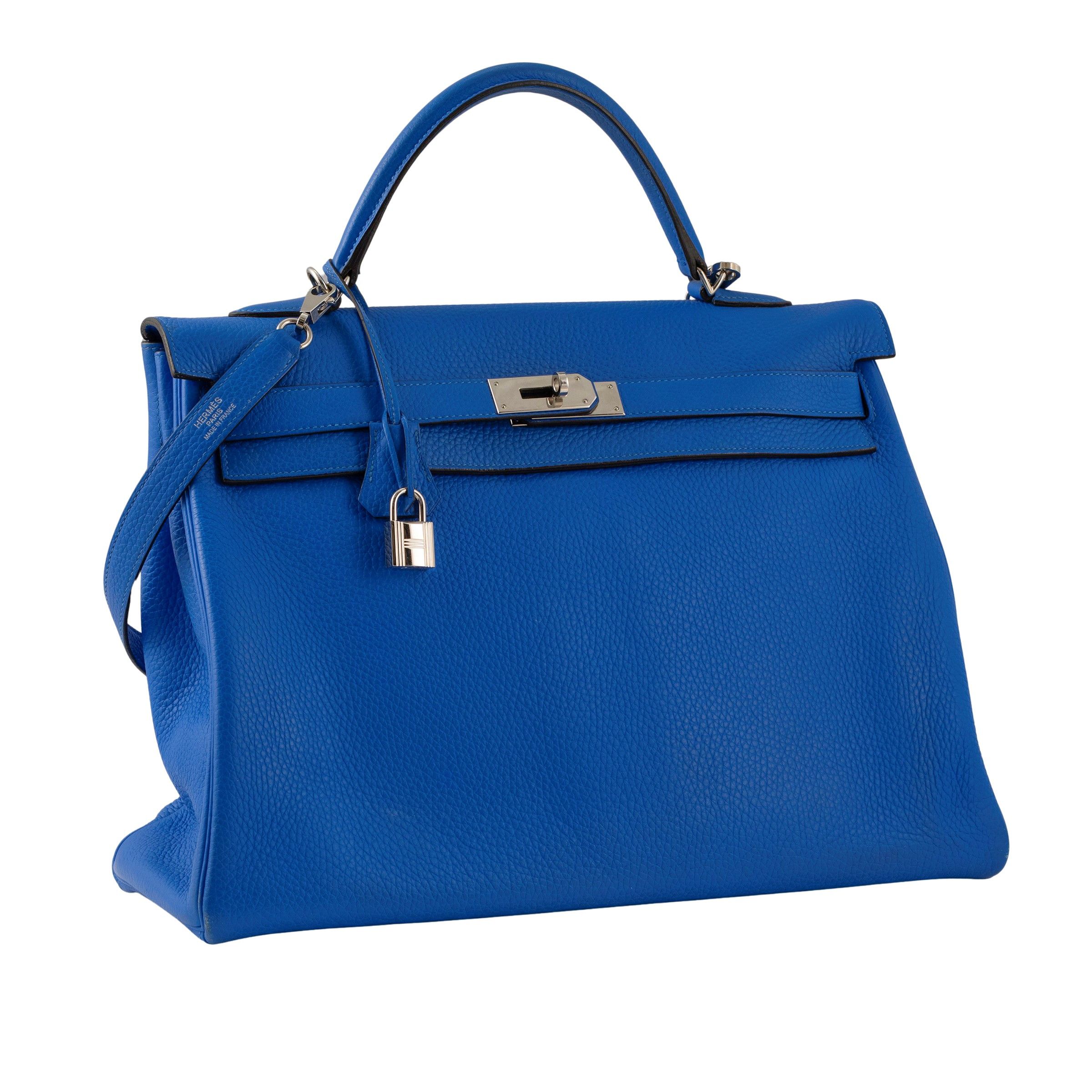 misure 30x40x14 cm. anno 2012 in pelle Chevre Mysore colore Bleu Hydra, finiture in palladio, interno in pelle ad uno scomparto con tre tasche di cui una a cerniera, chiusura a lucchetto, manico in pelle, completa di bandulaire e dust bag, condizioni buone