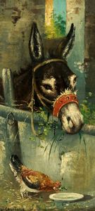 Lepre appesa, testa di vitello, cacciagione, piccione vivo, funghi in un cesto, [..]